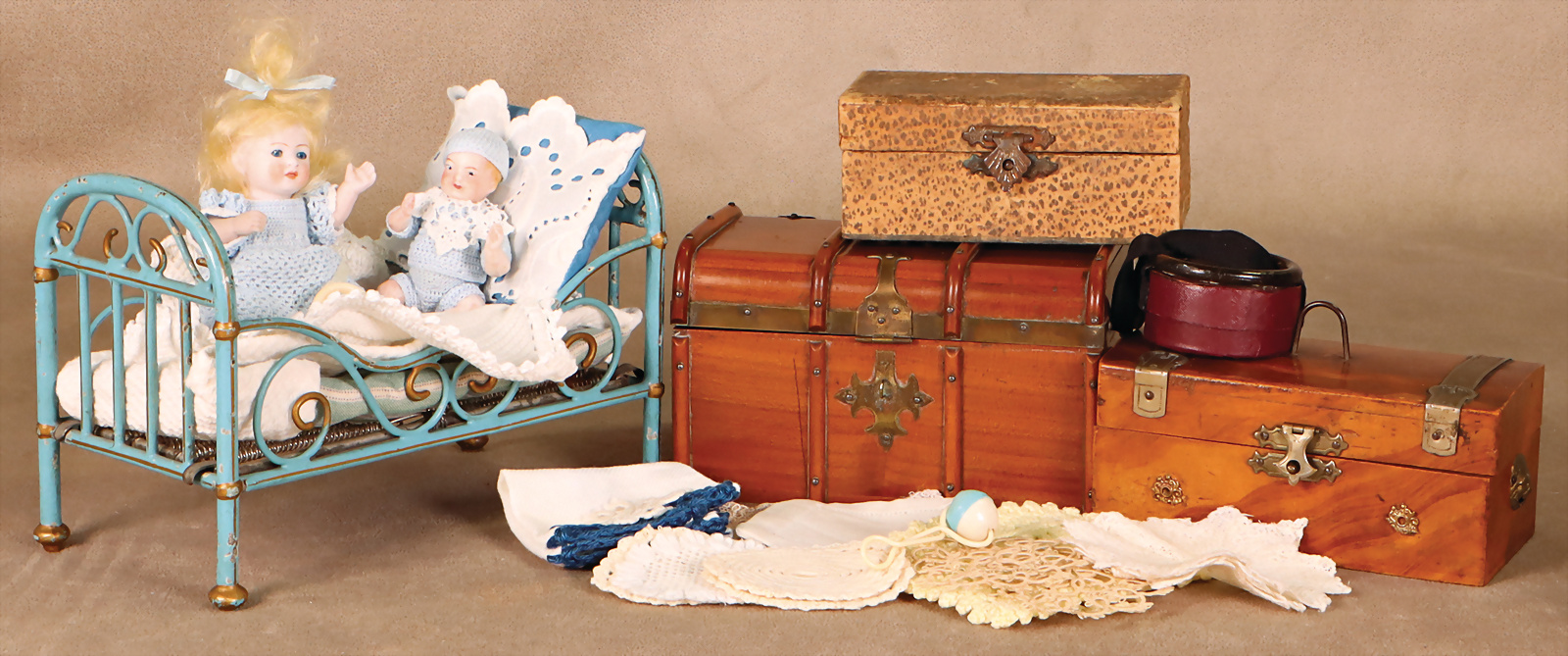 Konv. 3 Puppenkoffer, 9,5 - 12,5 Zentimeter, mit Zubehör, Puppenbett, Blech 2 Ganzporzellan-Puppen, 15,5 cm