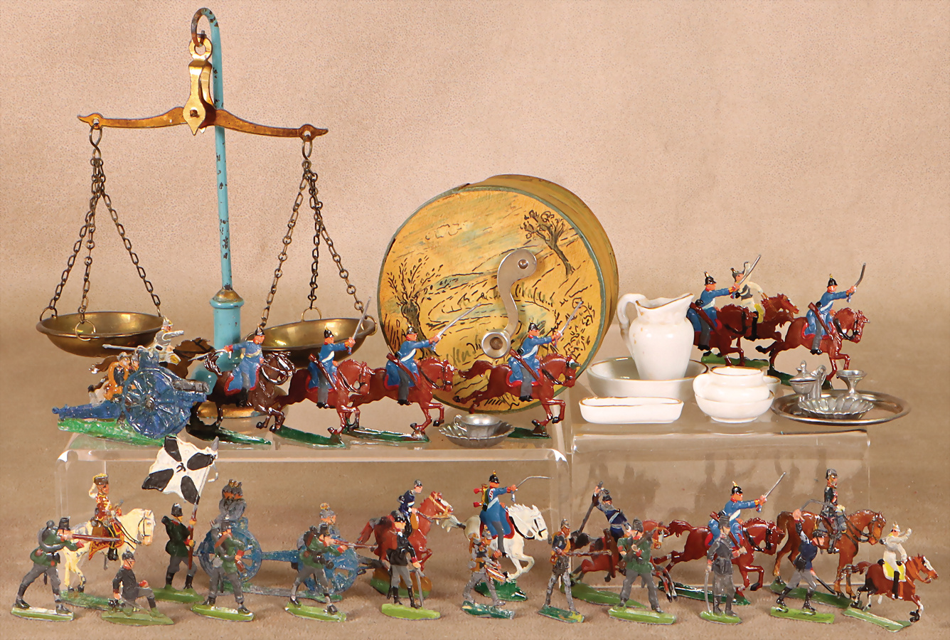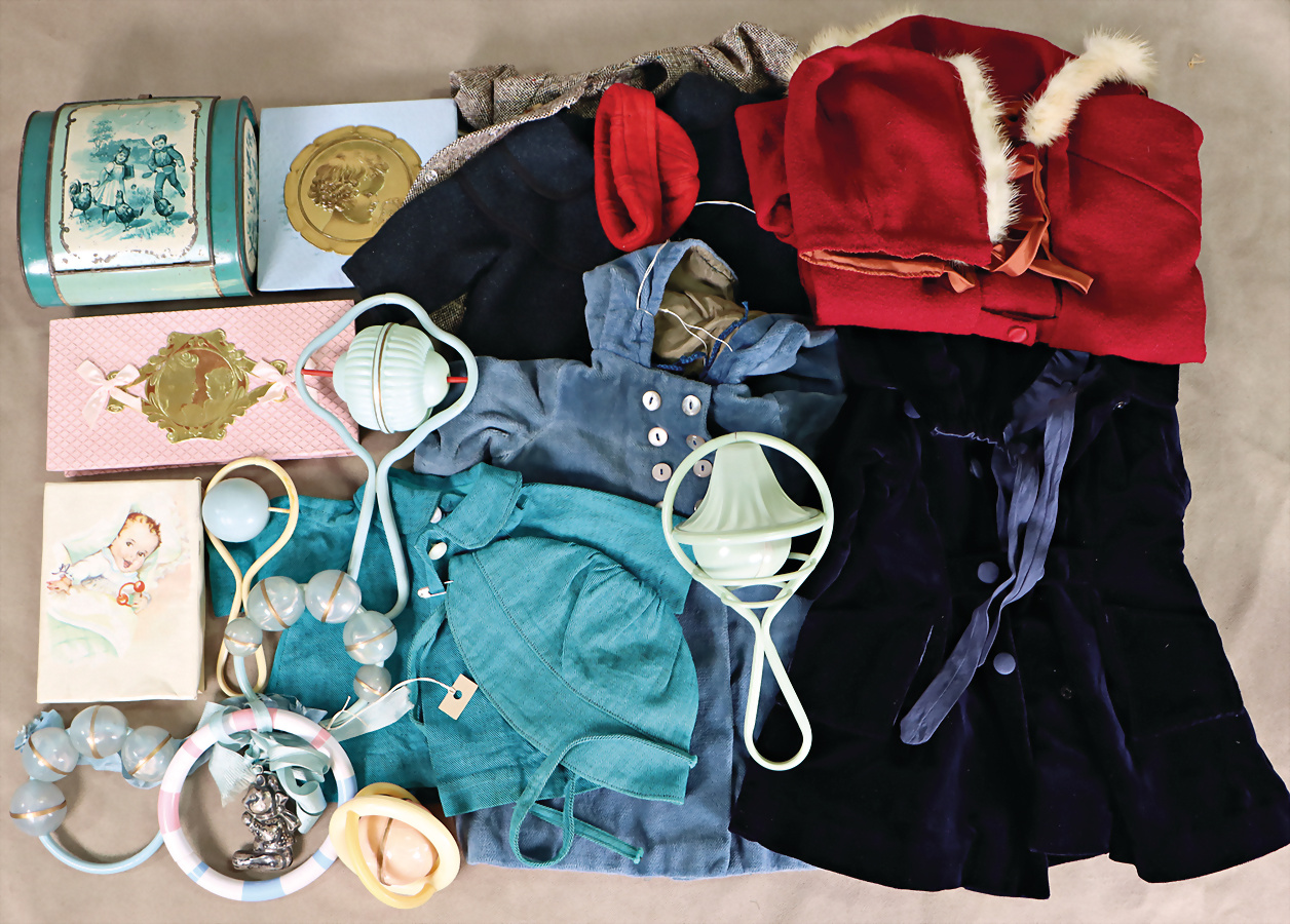 Konv. Botanisiertrommel, lithographiert, H: 12,5 cm, einige Teile Puppenkleidung, Kinderrasseln, Celluloid, 2 Kinderrasseln versilbert