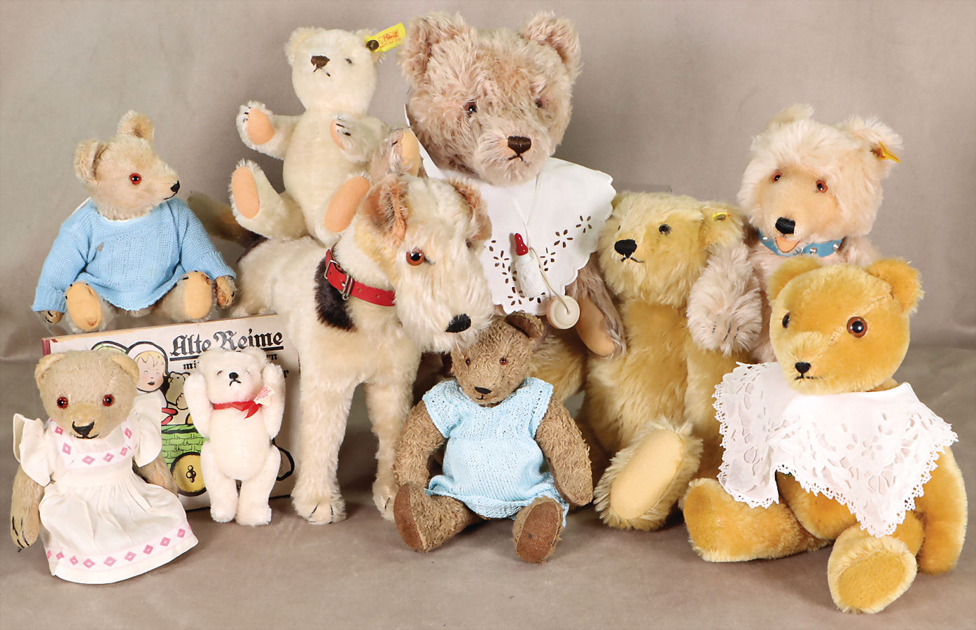 Konv. STEIFF u.a. Bären, 5 Teile neuere Produktion, meist mit Knopf, eine der Fahnen abgeschnitten, Original-Teddy, 37 cm, ohne Knopf und Schild u. mit Knopf u. Fahne, verschließen, dazu 3 kleine Bären, Nachkrieg