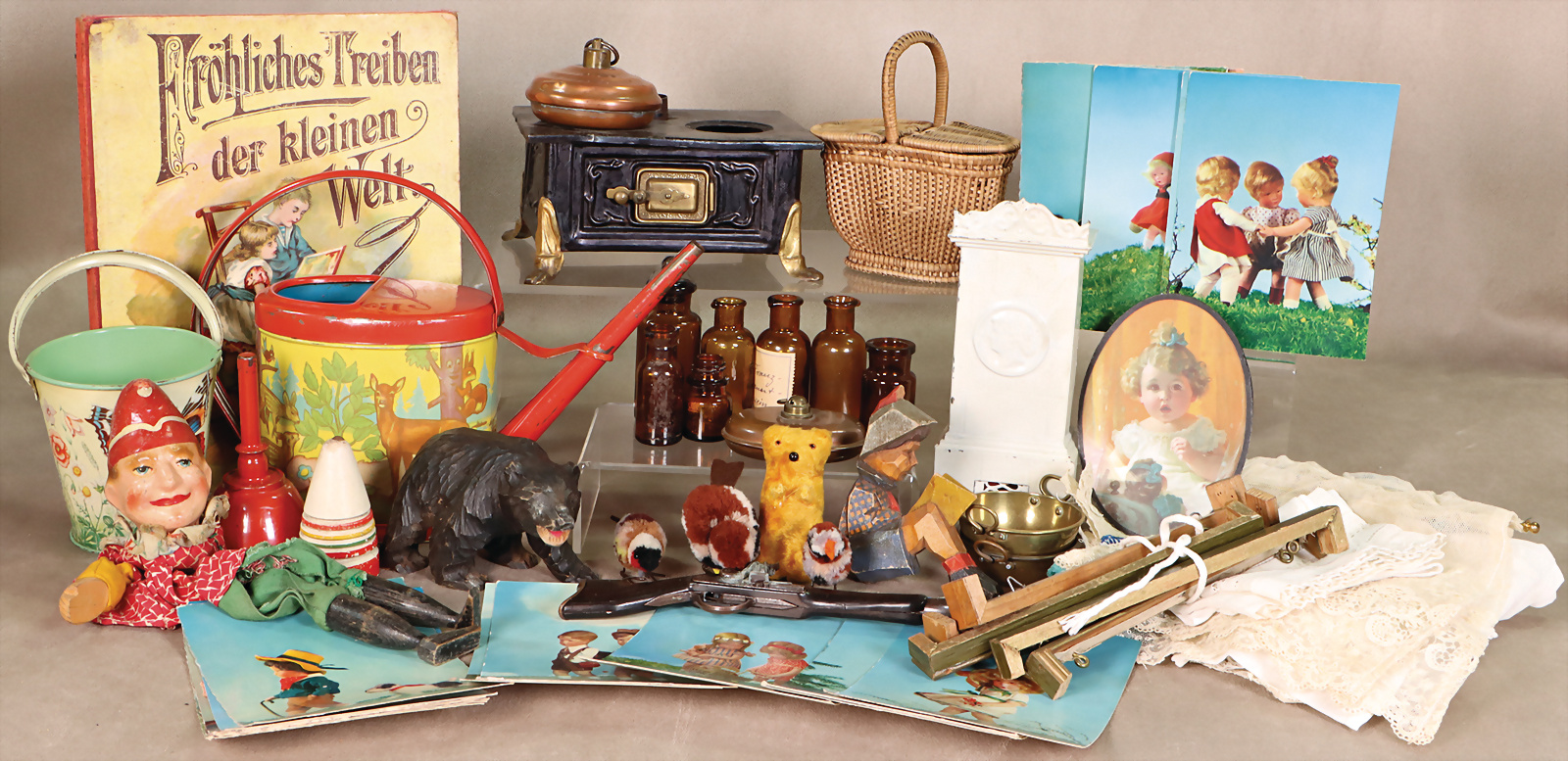 Fundkiste Käthe Kurse, einige Postkarten, Blecheimer, Gießkanne, Puppenstuben-Herd, ohne Topfsatz und Schornstein, Korb, Blech Ofen ohne Bodenblatte, 3 STEIFF Vögel, Wollminiaturen, Kleinteile
