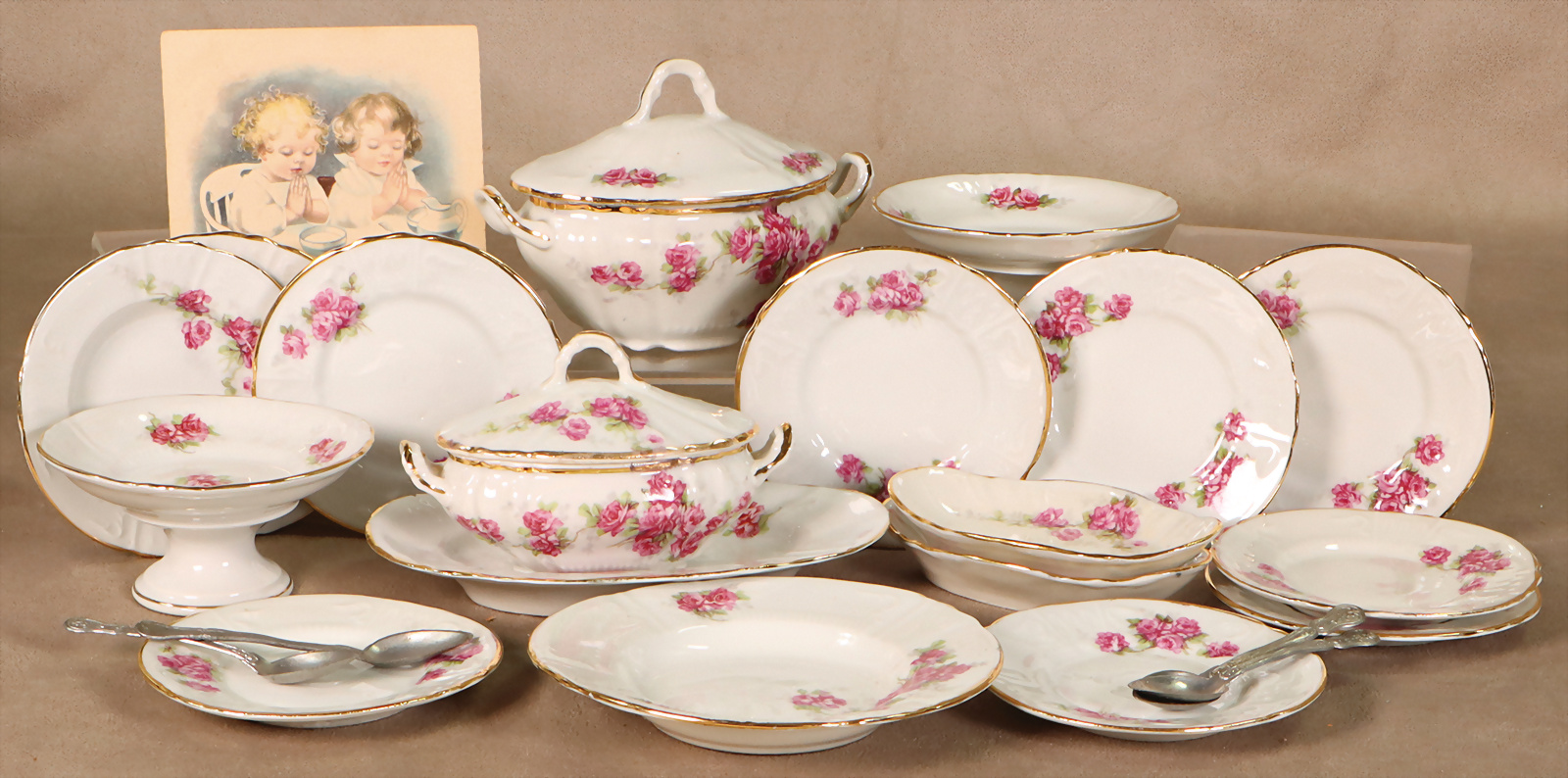 Puppenstuben-Speise-Service, Rosendekor, Porzellan, 2 Schüsseln mit Deckel, 8 flache Teller, D: 9 cm, 2 tiefe Teller, Anbietschalen, bis auf 1 kl. Abplatzer guter Zust.