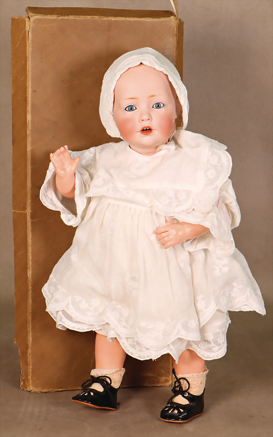 Hilda, 36 cm, blaue fest einges. Glasaugen, off. Mund, oben Zähne, Vollkopf, Masse-Stehkörper, mit unterschiedlicher Handhaltung, bitte Transportrisiko für die Augen beachten