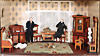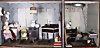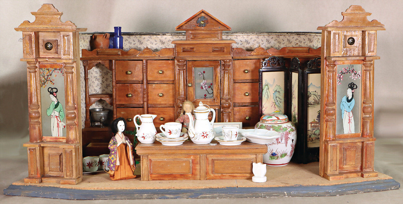 Puppenstuben-Kaufladen, B: 80 cm, H: 37 cm, eingerichtet als asiatischer Laden, an den Fenstern mit asiatischen Motiven bemalt, mit Theke u. Zubehör, Zubehör aus unterschiedlicher Zeit
