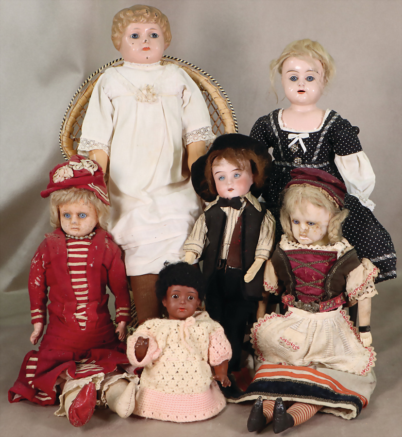 Papiermaché-Brustblattkopf-Puppe, Wachs überzogen, 40 cm, blaue fest einges. Glasaugen, Beschädigungen am Kopf, Stoffkörper, Lederarme, alte Kleidung, altersbedingt verschlissen, Wachs überzogene, Papiermaché-Puppe, 40 cm, Mottenschäden, Krakeleebildung im Wachs, 1 Puppe, einfacher Biskuit-Kopf, Augen falsch eingesetzt, Körper Bastelarbeit, 1 farbige Puppe, Beine fehlen, 2 Puppen, Blech, Brustblattkopf, Glasaugen, 1x Perücke, 1x modellierte Haare