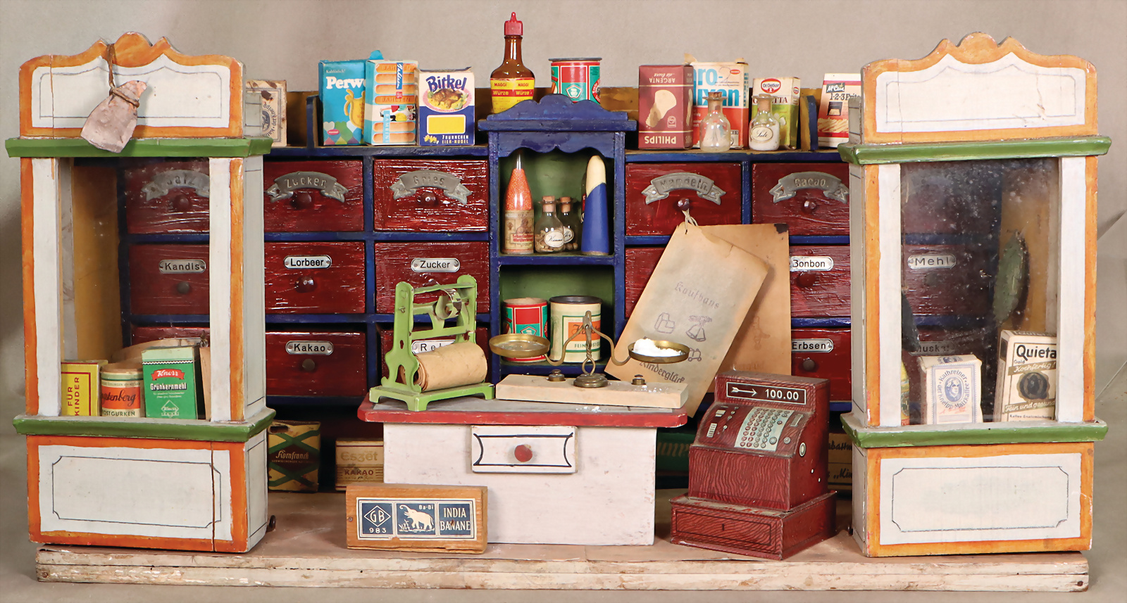 Kaufladen, B: 56 cm, H: 30 cm, vorne Schaufenster, Schubladen mit geschwungenen Blechschildern, mit Theke, farblich überarbeitet, Zubehör aus unterschiedlicher Zeit