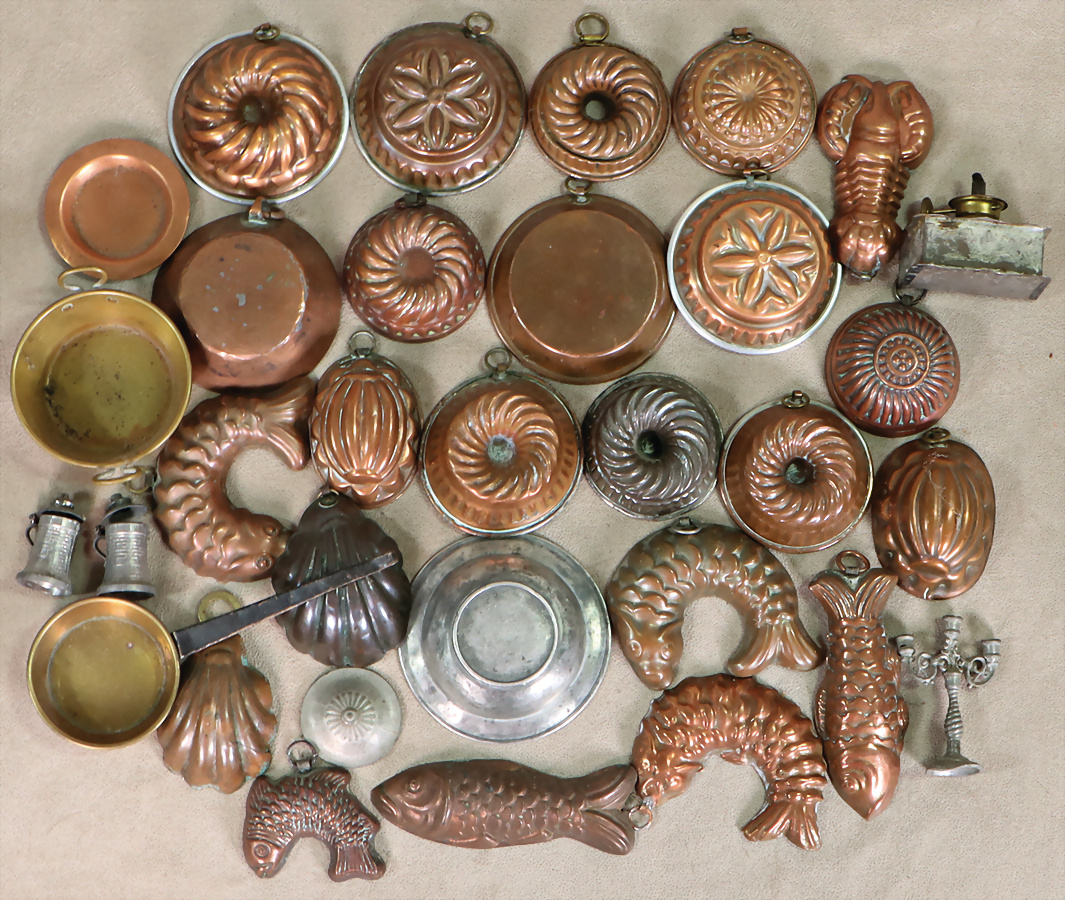 Gr. Konv. Puppenküchen-Ausschmückungsteile, Kupfer, innen verzinnt, Weißblech, Fischform, Hummerform, Kannen