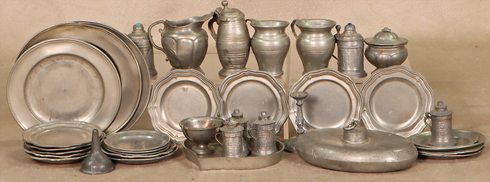 Schönes Konv. Zinn, Kanne mit Deckel, 6 cm, Kanne mit eingelegtem Stein, 4,6 cm, Bettflasche, Teller