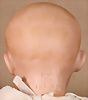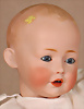 Konv. Puppen, Porzellankopf-Puppe, 45 cm, Kurbelkopf, blaue Schlafaugen, off. Mund, oben Zähen, Kinngrübchen, HEUBACH, Hufeisen, Porzellan-Brustblattkopf, Lederrumpf, im Wickelkissen, 1 Puppe, Papiermaché, einfacher Papiermaché-Körper, nicht lackiert, Baby-Puppe, Einbindekopf, stärker bespielt
