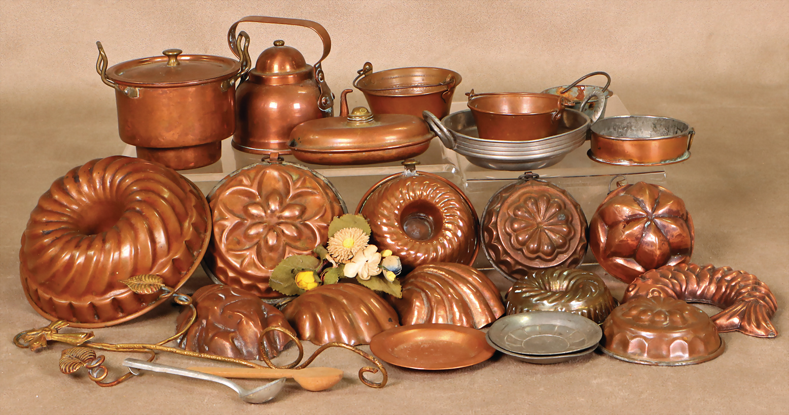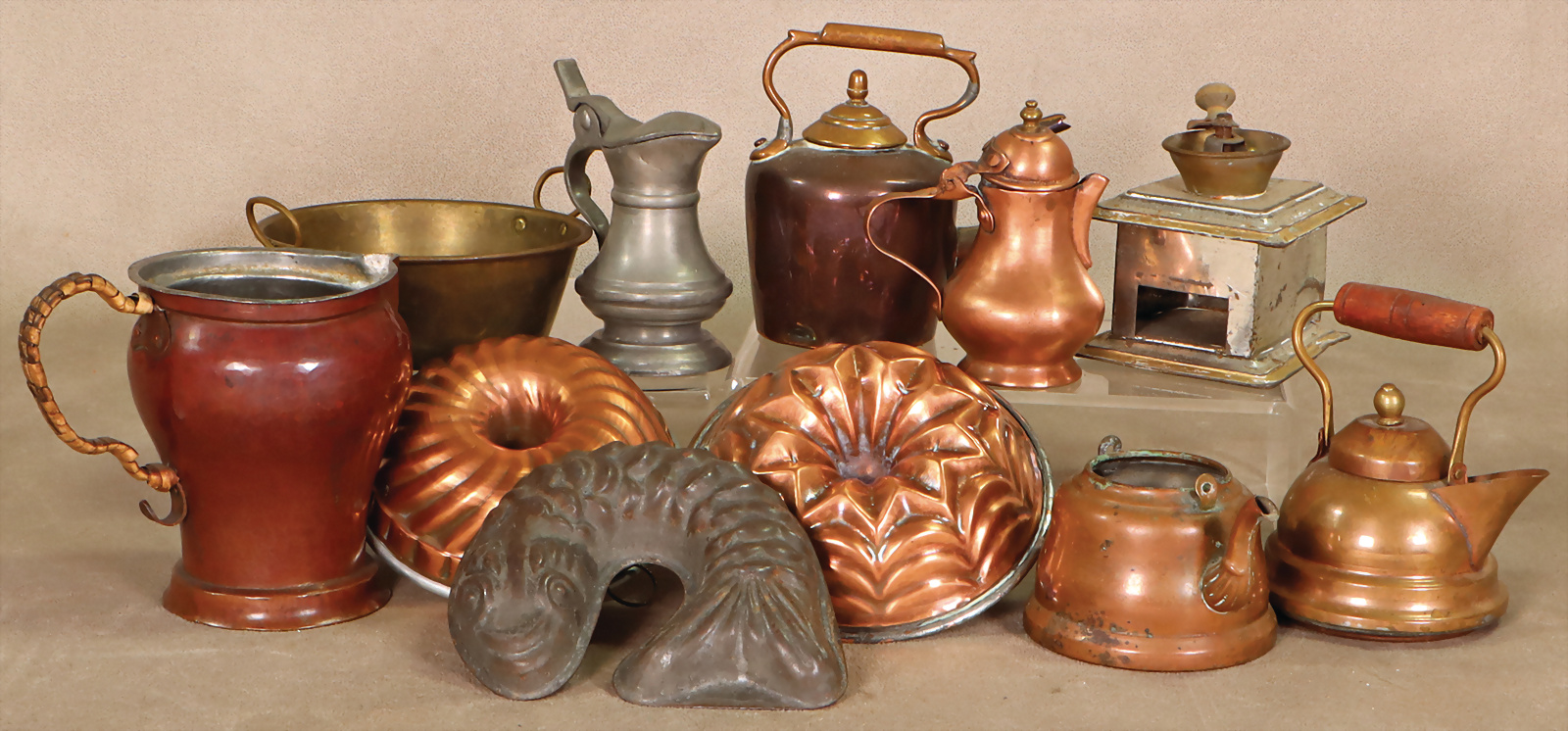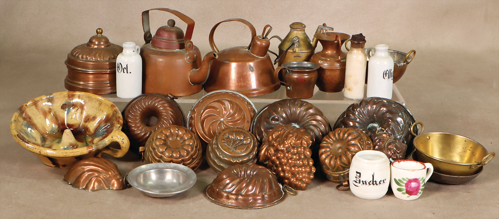 Konv. Puppenküchen-Ausschmückungsteile, Kupfer, innen verzinnt, Backformen, Brotdose, Kanne, Schalen, 1 Petroleum-Kanne, 6 cm, Essig- u. Öl-Karaffe