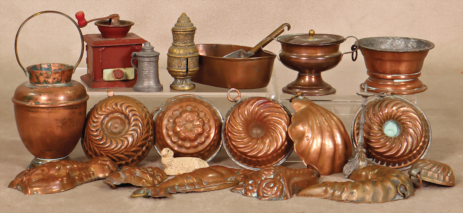Konv. Puppenküchen-Ausschmückungsteile, meist innen verzinnt, Backformen, Schalen, dazu 1 Krug mit Deckel, 6 cm, ursprünglich Maßband, Maßband fehlt, 1 Kaffeemühe