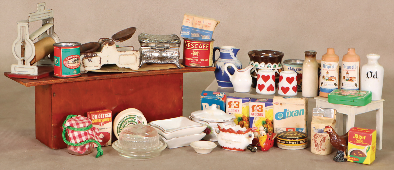 Konv. Puppenküchenteile, für gr. Küche, Backformen, Schalen, Kannen, Kaffeemühle ohne Schieber