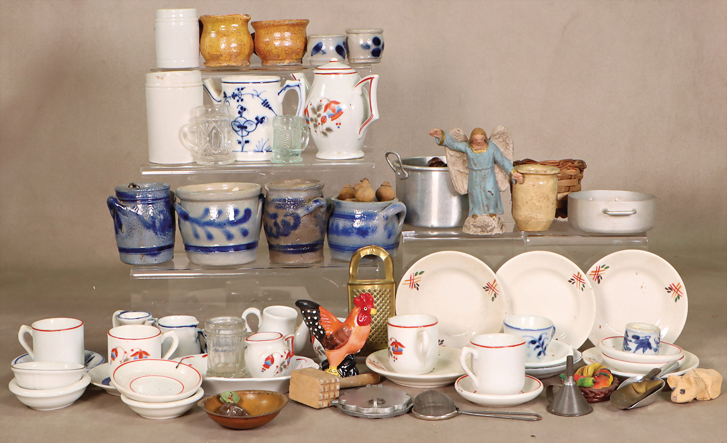 Konv. Puppenküchen-Teile, Porzellan-Service, Tassen, Teller, Krüge, Keramikteile, meist guter Zustand