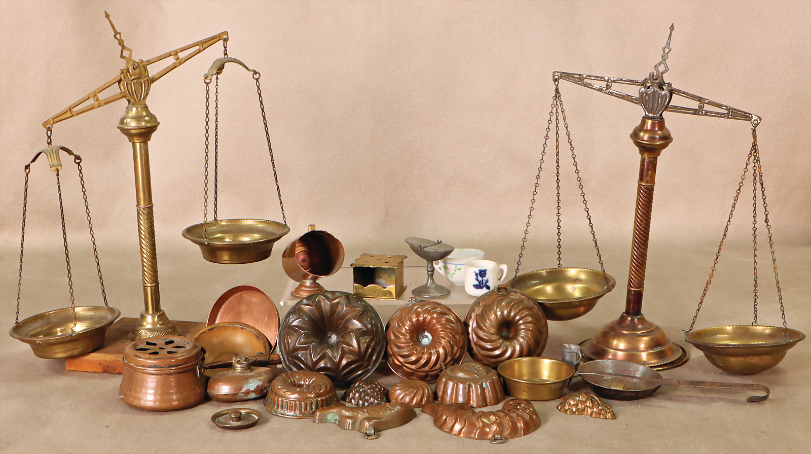 Konv. 2 Tellerwaagen, Backformen, Kupfer, innen verzinnt, 1 Bettpfanne