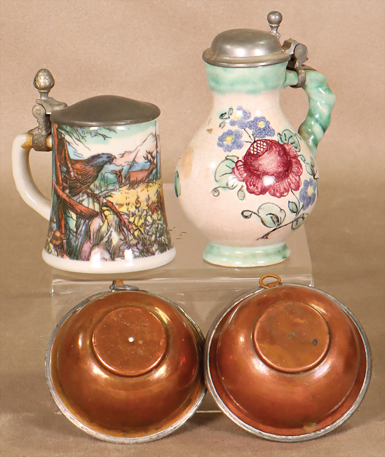 Konv. Puppenküchenteile, Keramik, Kanne mit Zinnedeckel, H: 9,5 cm, Porzellan-Kanne, mit Zinndeckel, 7 cm, 2 Kupferschalen innen verzinnt