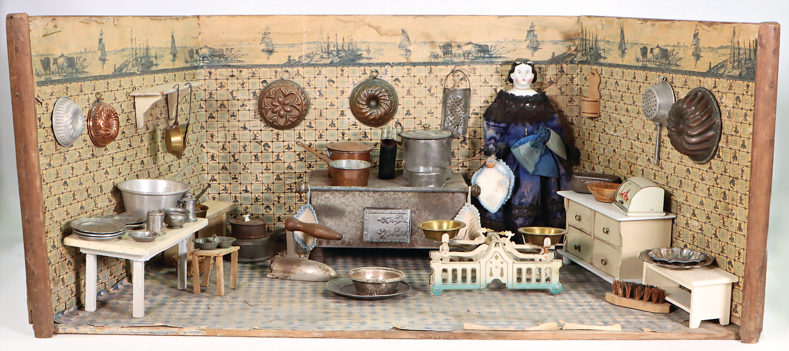 Puppenstuben-Küche, B: 78 cm, H: 35 cm, T: 44 cm, mit Puppe u. Zubehör, Tapete Delfter Kachelmuster, Bodentapete verschlissen, Herd nicht kompl.