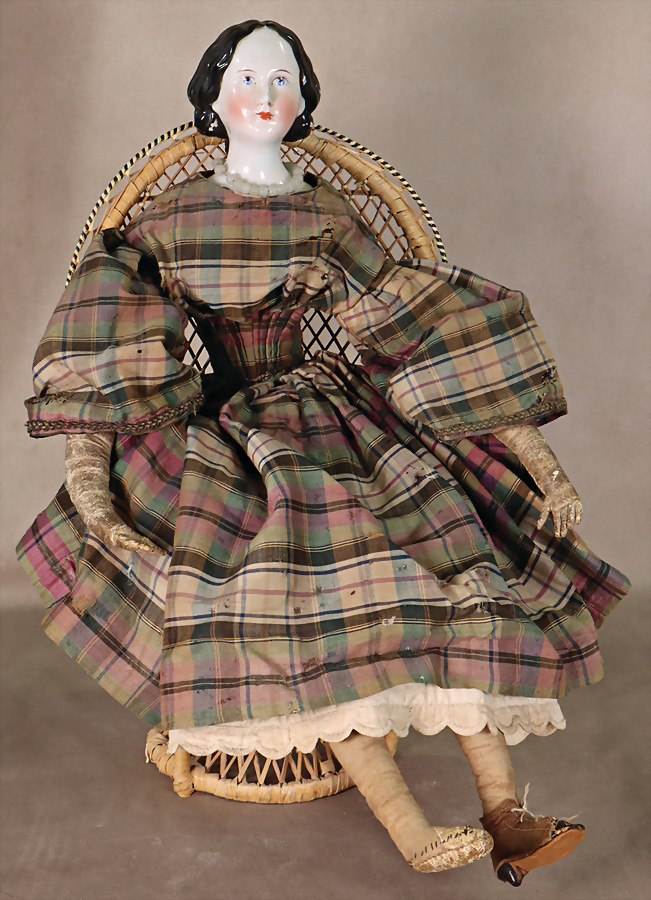 Biedermeier-Puppe, glasiertes Porzellan, 56 cm, Brustblattkopf, blaue gemalte Augen, geschl. Mund, fein ausmodell. Haare, ein wenig Farbabrieb an den Haaren, Stoffkörper, Lederarme, mit einzeln abgenähten Fingern, alte Kleidung u. Unterkleidung, 1 Schuh fehlt