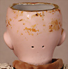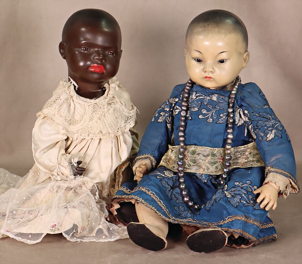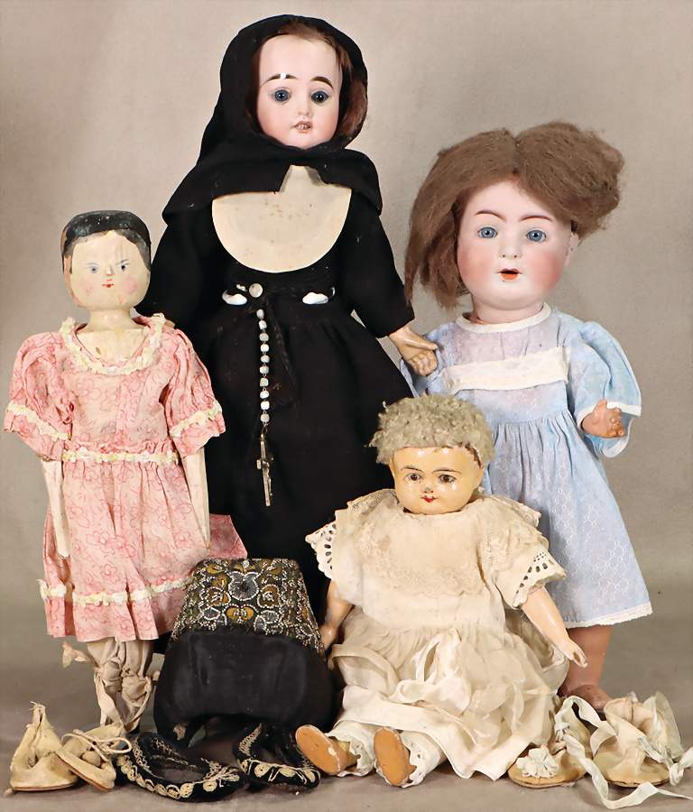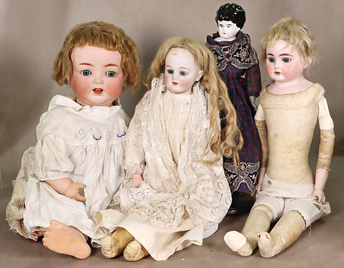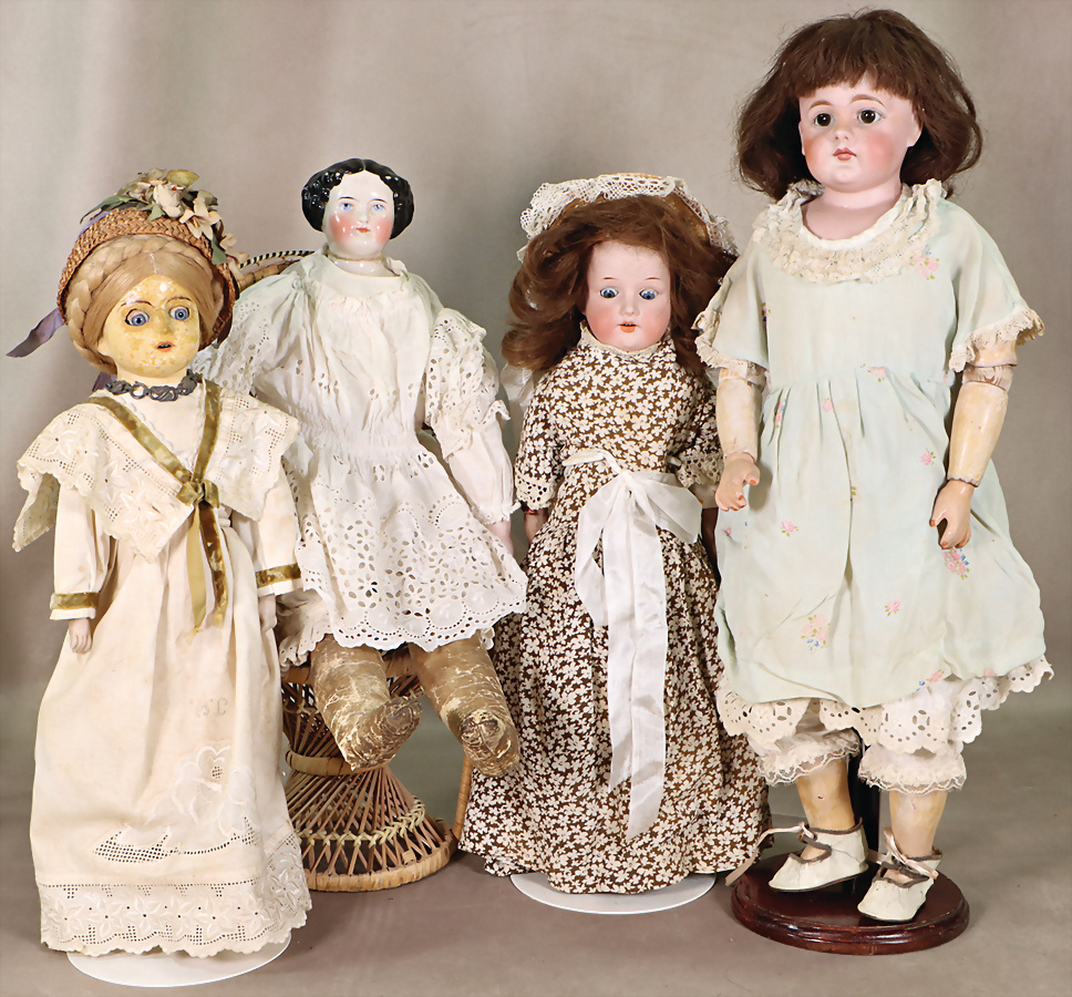 Konv. Puppen, Porzellan-Brustblattkopf-Puppe, 51 cm, braune fest eingesetzte Glasaugen, geschl. Mund, Kinngrübchen, Lederkörper, Holz-Masse-Arme u. -Beine, Kopf restauriert, China-Head, glasiertes Porzellan, Brustblattkopf-Puppe, 49 cm, gemalte Augen, ausmodellierte Haare, Lederkörper mit Flickstellen, stärker bespielt, Riss am Brustblatt, Brustblattkopf-Puppe, 43 cm, blaue Schlafaugen, off. Mund oben Zähne, Kinngrübchen, Stoffkörper, Porzellan-Unterarme, Perücke wurde nicht entfernt, Riss auf der Stirn, Papiermaché-Brustblattkopf-Puppe, 43 cm, Schlafaugen, off. Mund, schöne Orig.-Perücke, wurde nicht entfernt, Transportrisiko für die Augen beachten, Lederkörper, Porzellan-Unterarme