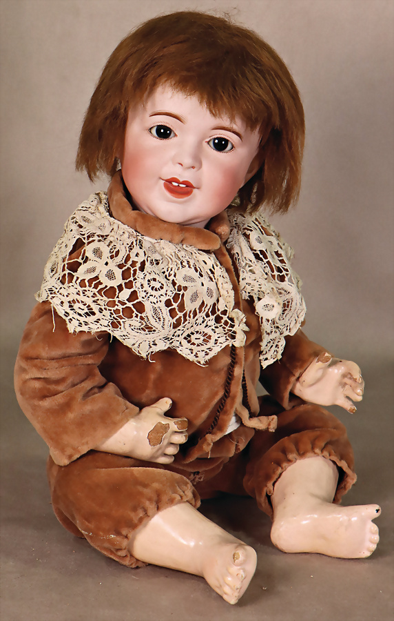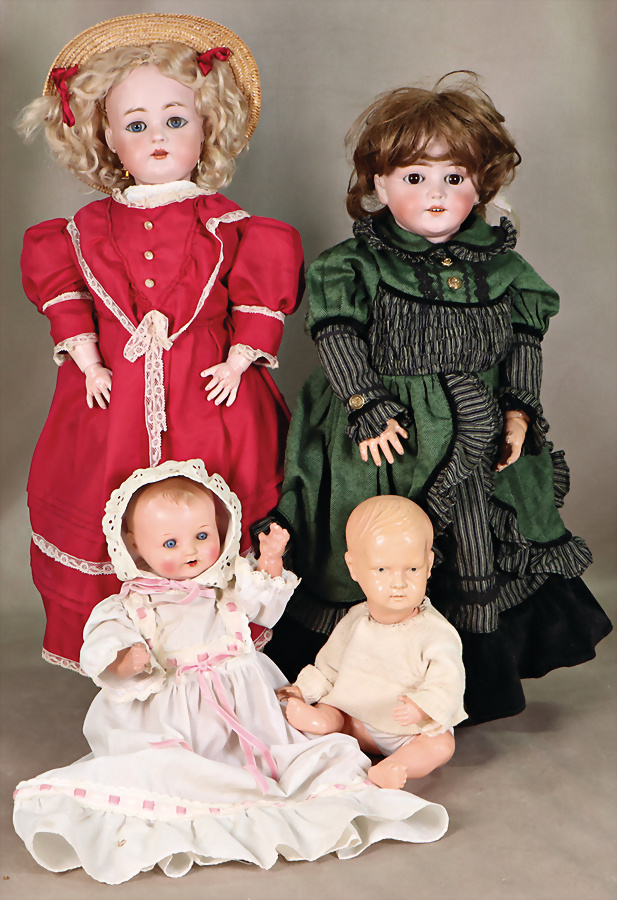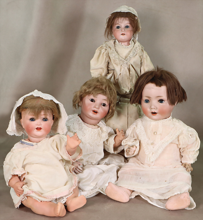 Konv. Puppen, SCHOENAU & HOFFMEISTER für BAEHR & PROESCHILD, Charakter-Puppe, 47 cm, blaue Schlafaugen, später eingesetzt, off. Mund, oben Zähne, stark bespielter Sitzbaby-Körper, 1 Daumen fehlt. Abplatzer an 1 Augenlid, alte Echthaar-Perücke, HEUBACH, 342, 38 cm, Echthaar-Perücke, stark ausgegangen, Sitzbaby-Körper, ausgebessert, ARMAND MARSEILLE, 370, Brustblattkopf-Puppe, 53 cm, blaue Schlafaugen, off. Mund, oben Zähne, Kinngrübchen, Lederkörper, Porzellan-Unterarme, REVALO, Charakter-Baby, 44 cm, Kurbelkopf, braune Schlafaugen, off. Mund, oben Zähne, Sitzbaby-Körper, Körper stark bespielt, mit einigen Fehlstellen, alte Echthaar-Perücke