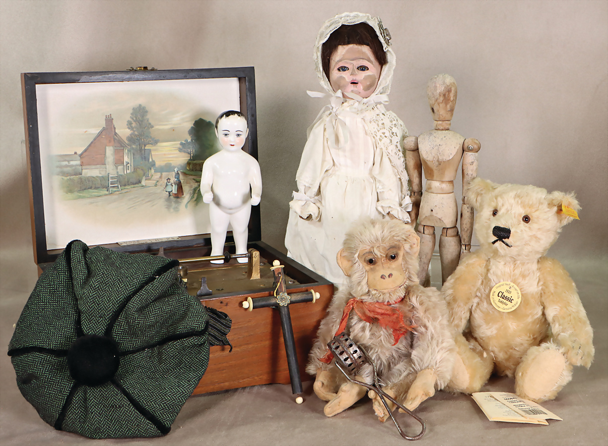 Konv. Symphonion, ohne Funktion, Uhrwerk läuft aber es fehlen wohl Zwischenteile, Holzpuppe, 36 cm, starker Farbabrieb im Gesicht, Holz-Gliederpuppe, Beine fehlen, stilisierter Affe, wohl SCHUCO, 1 Classic-Bär, 1 Badepuppe, neuer