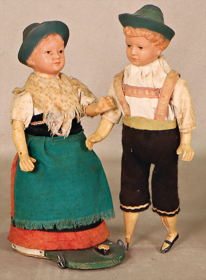 Laufpuppe, Trachtenpaar, 22 cm, Uhrwerk hakt ein wenig, Junge am Fuß lose