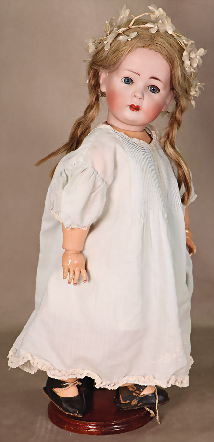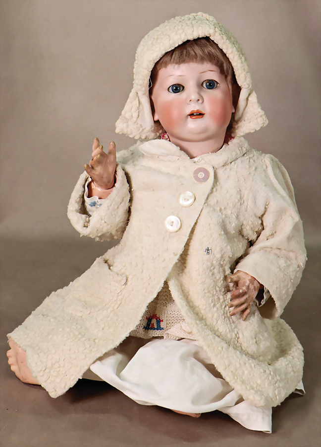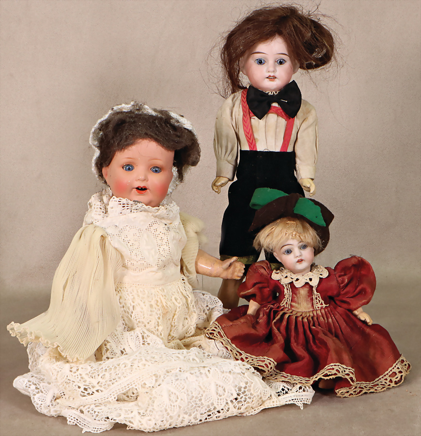 Konv. Puppen, SIMON & HALBIG / KÄMMER & REINHARDT, vorne gekennzeichnet mit W, Porzellan-Kurbelkopf-Puppe, blaue nachträglich fest eingesetzte Glasaugen, off. Mund, oben Zähne, Gliederkörper, Körper überarbeitet, alte Mohair-Perücke, SCHOENAU & HOFFMEISTER, 3800, 56 cm, braune Schlafaugen, off. Mund, oben Zähne, Kinngrübchen, Gliederkörper, Echthaar-Perücke, Hände zu groß, dazu ARMAND MARSEILLE, Masse-Vollkopf-Baby, blaue Schlafaugen, off. Mund, oben Zähne, 1 Daumen fehlt, Transportrisiko für die Augen beachten, 1 Masse-Puppe, SCHILDKRÖT