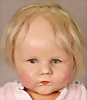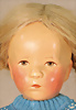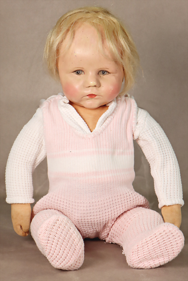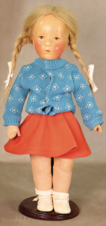 Deutsches Kind, Mädchen, 38 cm, Stoffkopf, Hinterkopfnaht erst unter der Perücke sichtbar, in den Kniekehlen abgenäht, Nase etwas berieben, KÄTHE KRUSE Stempel schwach erkennbar