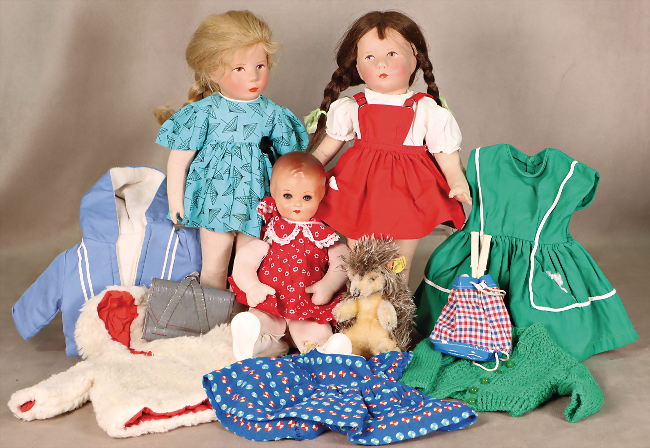 Konv. 50er Jahre, 2 Mädchen, blond u. brünett, Kunststoffkopf, brünette Puppe, Naht an 1 Arm etwas off., sonst beide Puppen in sehr gutem Zustand, 1 Baby mit Uhrwerkantrieb, einige Teile Puppenkleidung