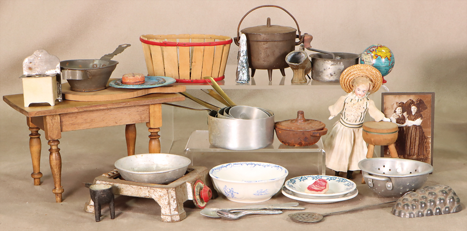 Konv. Puppenküchen-Ausschmückungsteile, Reibe, Hackklotz, Töpfe, Tisch, 1 Puppenstuben-Puppe, Porzellan-Brustblattkopf, Porzellan-Arme u. -Beine, Stoffkörper, H: 14 cm