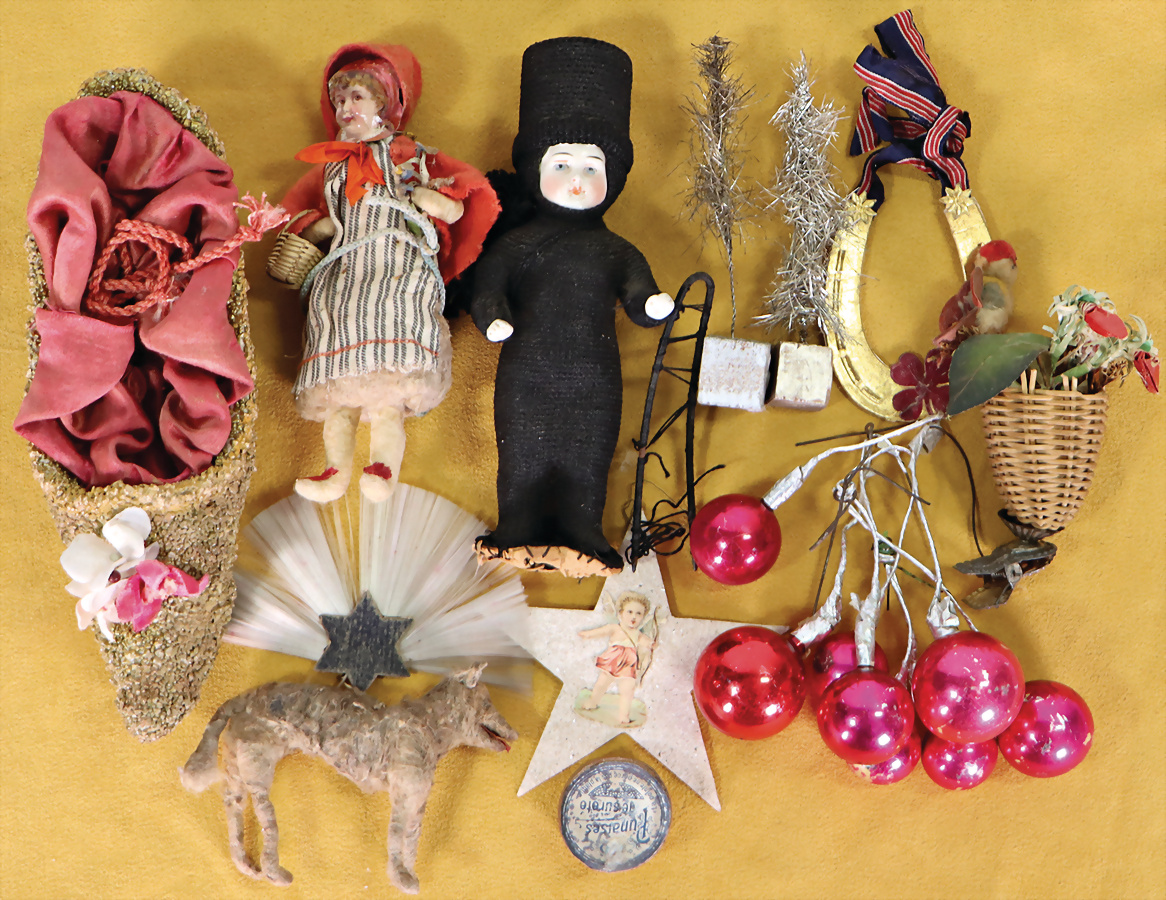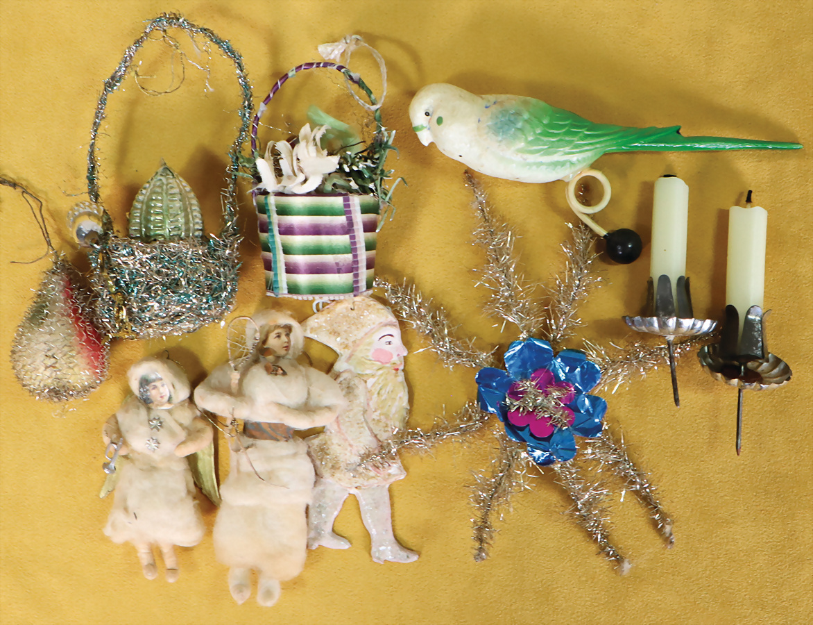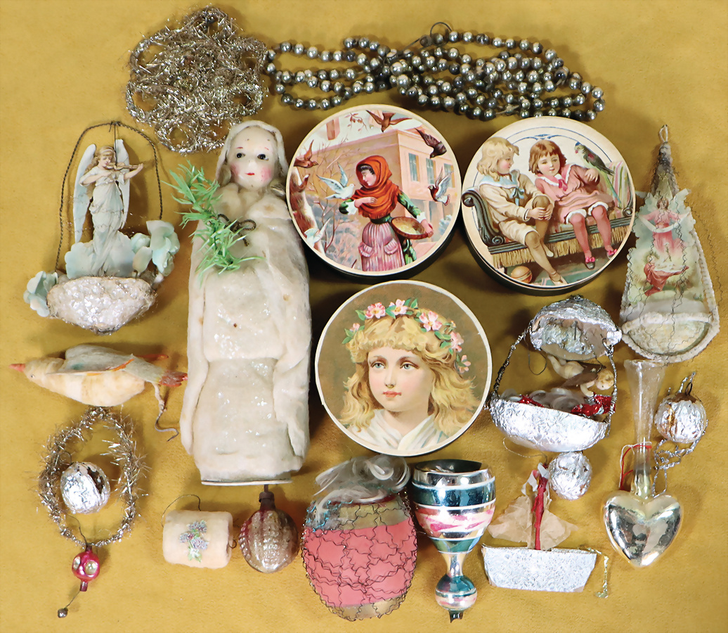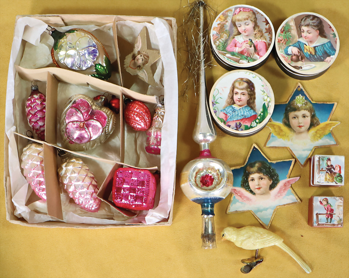Konv. Christbaumschmuck, aus untersch. Zeit, Candy-Container, Wachskopf, Wattekleid, 19 cm, Vogel, Watte, mit Papierflügeln, Oblaten-Bilder, leonische Drähte, Glasteile, 3 Pappschachteln, bunt lithografierte Deckbilder, 9 cm