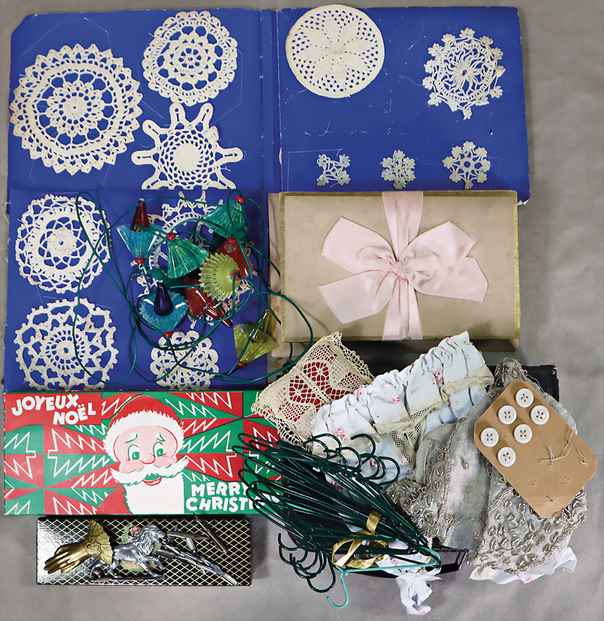 Fundkiste, teils Christbaumschmuck, 2 Lichterketten, Oblaten-Bilder, Perlenstickarbeit, Stickereien
