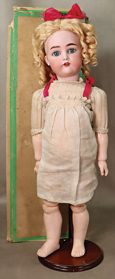 Porzellankopf-Puppe, 62 cm, Kurbelkopf, blaue Schlafaugen, off. Mund, oben Zähne, schöner, ausgeformter Gliederkörper, schöne volle Mohair-Perücke, im Orig.-Karton, mit original Hemd