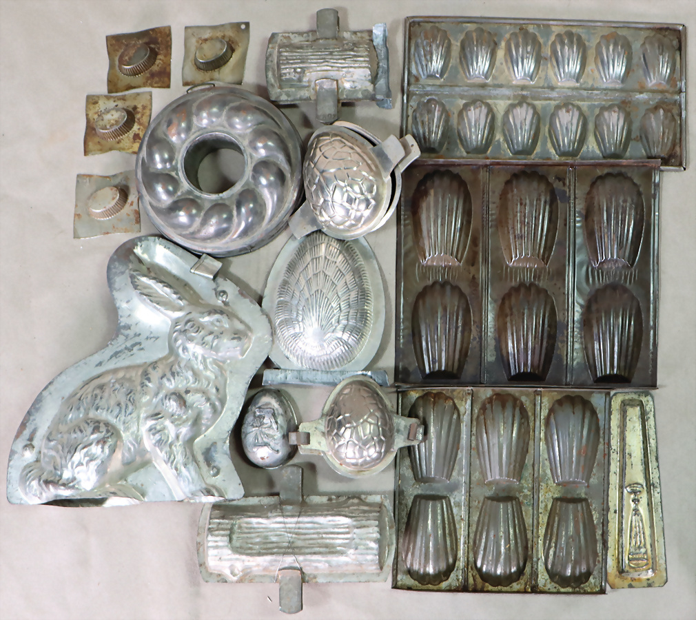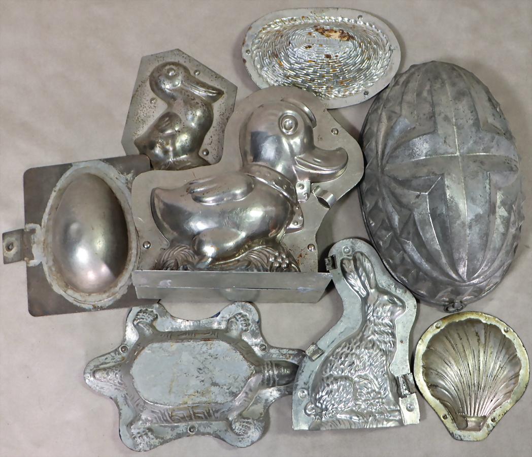 Konv. Schokoladenformen, Blech, halbe Schale, Ei, 29,5 cm, außergewöhnliche Gr., gr. Ente, 24,5 cm, kl. Ente, Muschel, Schildkröte, Hase, H: 21,5 cm