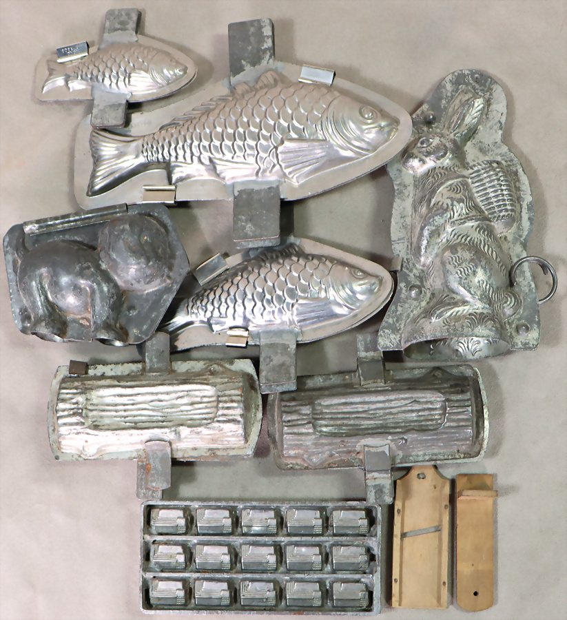 Konv. Schokoladenformen, Blech, Osterhase, 22,5 cm, Hund, 11 cm, Fischformen in versch. Gr., Baumstamm