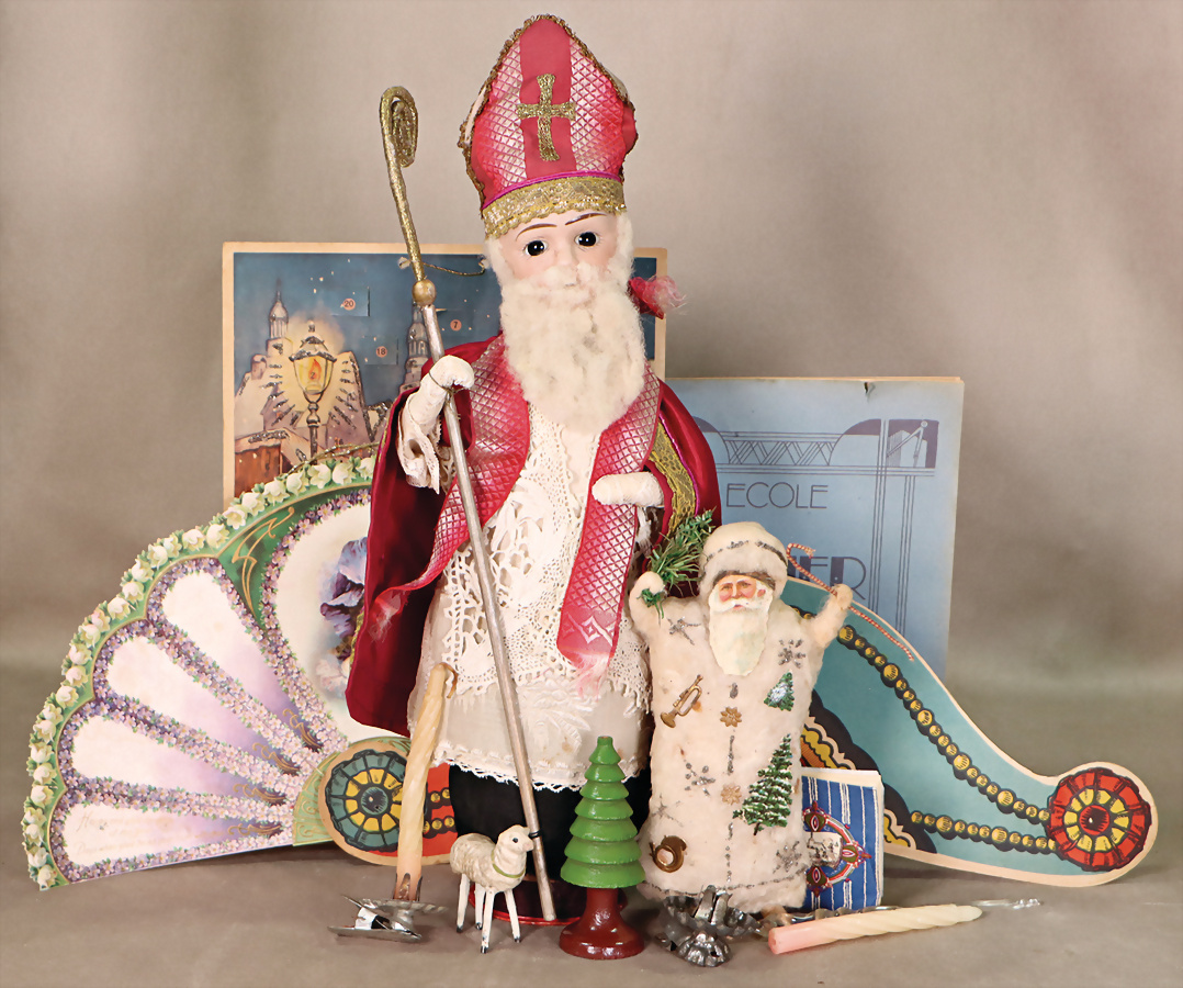 Fundkiste, Candy-Container, Weihnachtsmann, 35,5 cm, Biskuit-Kopf, Alter?, Wattefigur, Weihnachtsmann, Oblaten-Gesicht, 18 cm, Papierfächer, Weihnachtskalender