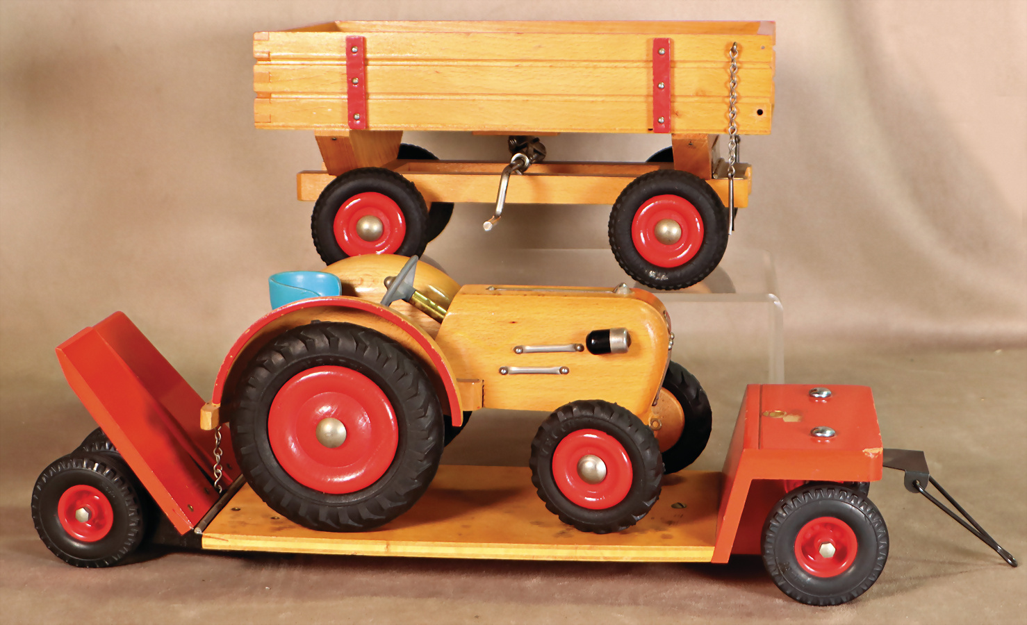 Holztraktor, BIGGE, mit STEIFF Tieflader, bespielt, gut, 1 Anhänger, guter Zustand