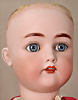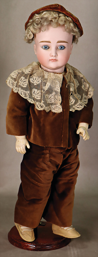 Konv. Puppe, HEUBACH 342, 57 cm, blaue Schlafaugen, off. Mund, Zähne u. Zunge, Masse-Stehkörper, alte Mohair-Perücke, Porzellan-Brustblattkopf-Puppe, gem. 1900 1, 60 cm, blaue Schlafaugen, off. Mund, Kinngrübchen, Perücke wurde nicht entfernt von außen keine Risse erkennbar, bitte Transportrisiko für die Augen beachten, Lederkörper, teilw. übernäht, mit Porzellan-Armen, Porzellan-Brustblattkopf-Puppe, Alter?, 57 cm, fest einges. Glasaugen, off. Mund oben Zähne, Lederkörper, Brustblattkopf-Puppe, glasiertes Porzellan, Lederkörper, Stoffbeine, wohl 30er Jahre
