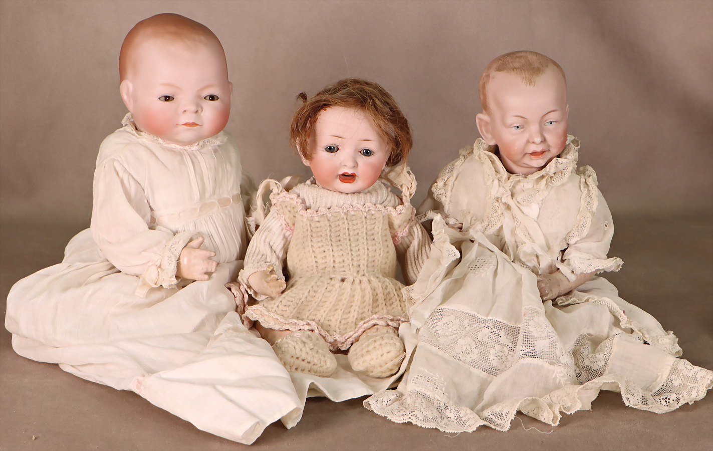 Konv. 3 Puppen, Beylo Baby, 30 cm, Porzellan-Kurbelkopf, braune Schlafaugen, geschl. Mund, Sitzbaby-Körper (Masse), ungewöhnlich, bitte Transportrisiko für die Augen beachten, kl. Charakter-Baby, wohl HERTEL, SCHWAB & CO, 25 cm, Kurbelkopf, blaue Schlafaugen, off. Mund, Zähne u. Zunge, Sitzbaby-Körper, Echthaar-Perücke, ausgegangen, KÄMMER & REINHARDT, 100, 28 cm, Kurbelkopf, blaue gemalte Augen, off./geschl. Mund, Sitzbaby-Körper mit unterschiedlicher Handhaltung u. leicht abstehendem Zeh, Körper bespielt, mit alten Reparaturstellen
