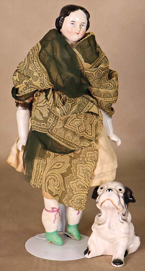 Biedermeier-Puppe, glasiertes Porzellan, Brustblattkopf, China-Head, 29 cm, ausmodellierte Haare, blaue gemalte Augen, geschl. Mund, Stoffkörper, Porzellan-Arme u. –Beine, kl. glasierter Porzellan-Hund, Sitzhöhe 9 cm