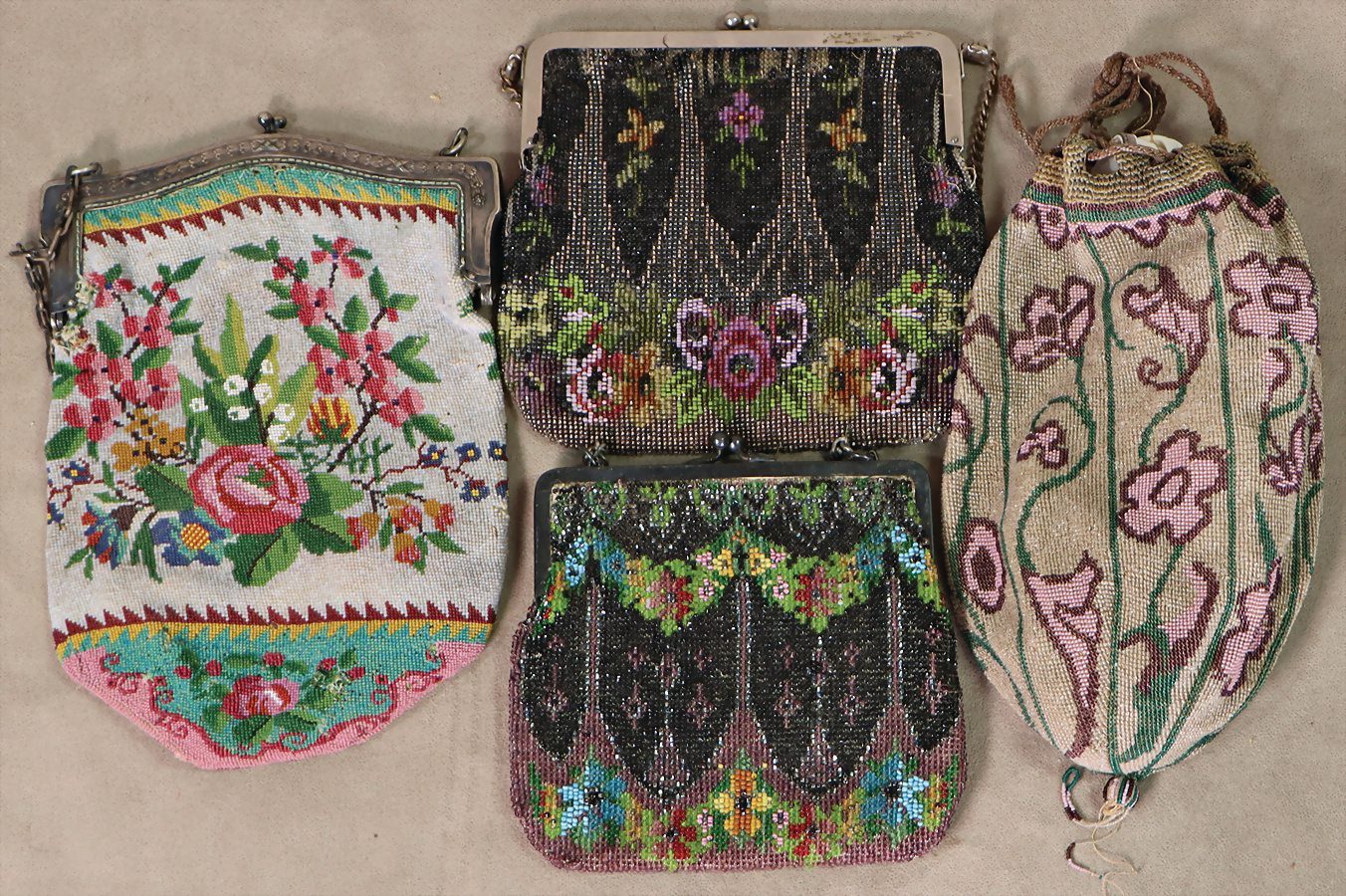 Konv. 4 Teile, Perlentaschen, 14,5-23,5 cm, 1 Tasche, kl. Fehlstellen, sonst guter Zustand