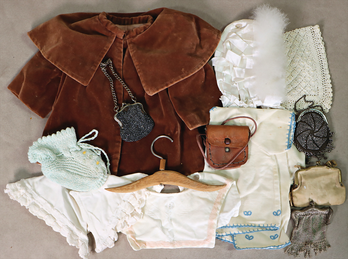 Konv. Puppenkleidung, unterschiedliche Zeit, dazu kl. Taschen, Leder-, Stoff- oder Perlenarbeit