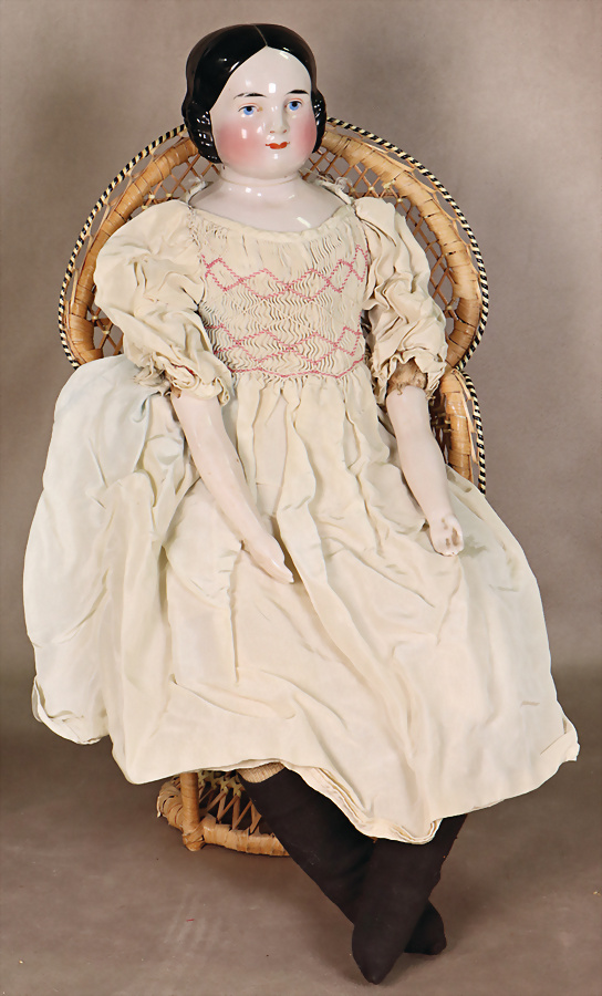 Biedermeier-Puppe, glasierter Porzellan Brustblattkopf-Puppe, China-Head, 58 cm, ausmodellierte Haare, blaue gemalte Augen, geschl. Mund, Stoffkörper, glasierte Porzellan-Arme u. –Beine, Flickstellen am Körper
