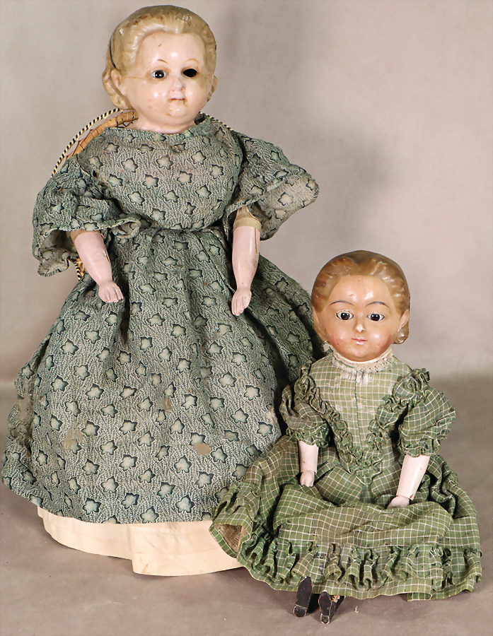 Konv. Puppen, Wachs überzogene, Papiermaché-Puppe, ca. 1880, 67 cm, ausmodellierte Haare, anmodellierter Haarreif, fest eingesetzte Glasaugen, 1 Auge sitzt etwas schief, Stoffkörper, Holz-Arme u. –Beine, 1 Fuß fehlt, Wachs überzogene Papiermaché-Puppe, 40 cm, ausmodellierte Haare, anmodellierter Haarreif, braune Glasaugen, Stoffkörper, Körper geflickt, möglicherweise ursprünglich bewegliche Augen, Flickstellen am Körper