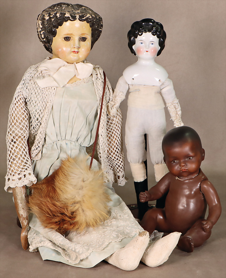 Konv. Puppen, Papiermaché-Brustblattkopf-Puppe, 60 cm, ausmodellierte Haare, gemalte Augen, geschl. Mund, Stoffkörper, 1 Arm liegt lose bei, Körper mit Fehlstellen, 1 Brustblattkopf-Puppe, glasiertes Porzellan, Biedermeier Stil, Körper neuer, 1x ARMAND MARSEILLE, farbiges Baby, gespritztes Porzellan, Vollkopf, 24,5 cm, braune Schlafaugen, geschl. Mund, Sitzbaby-Körper, bitte Transportrisiko für den Augenmechanismus beachten