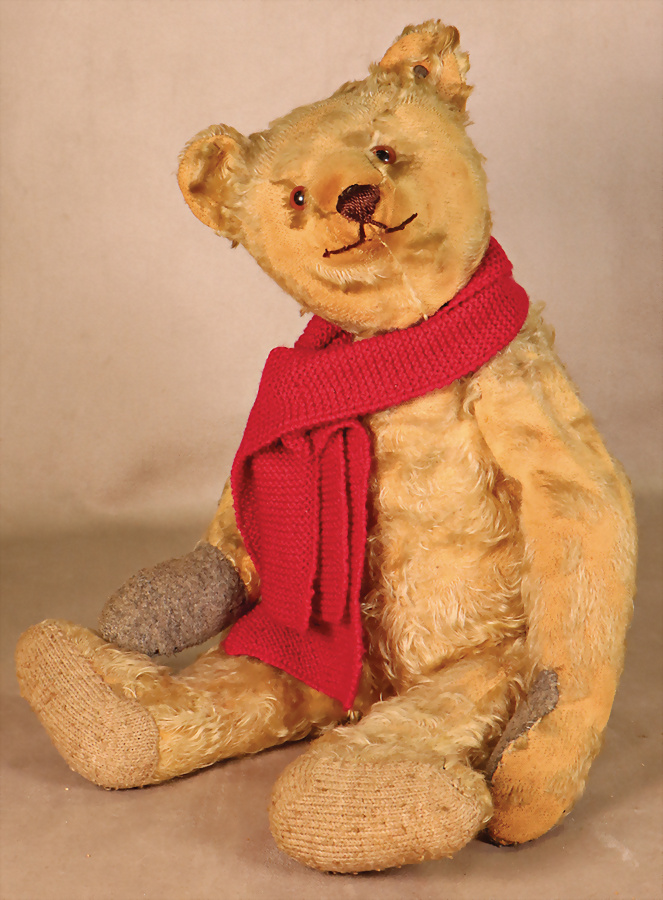 Bär, Vorkrieg, 52 cm, mit Knopf, mit Knopf, langgezogenes f, abgeliebt, Füllverlust, Tatzen übernäht, lange abgeknickte Arme, leichter Buckel