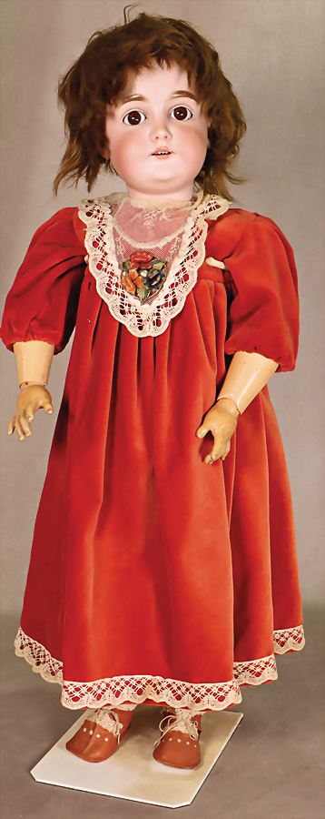 gem. A13 M DRGM, Porzellankopf-Puppe, 78 cm, Kurbelkopf, braune Schlafaugen, einges. Wimpern, schöner ausgeformter Gliederkörper, Körper etwas zu groß zum Kopf, Echthaar-Perücke