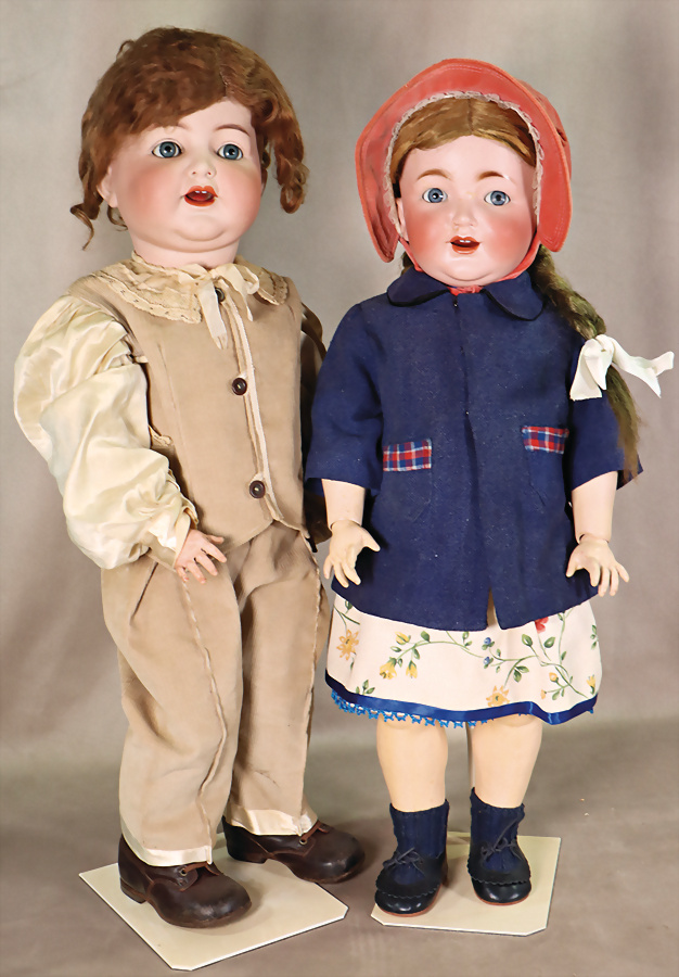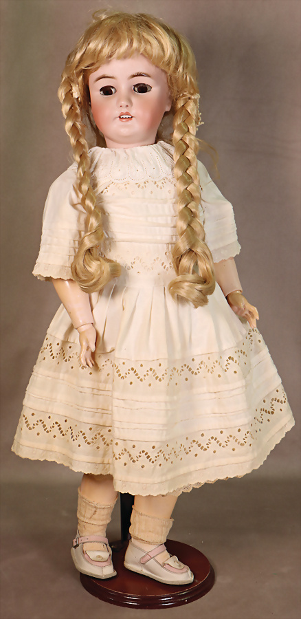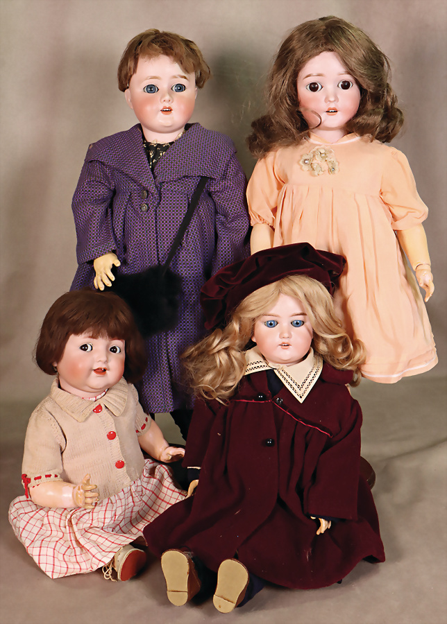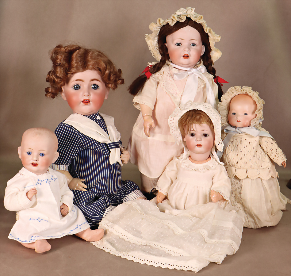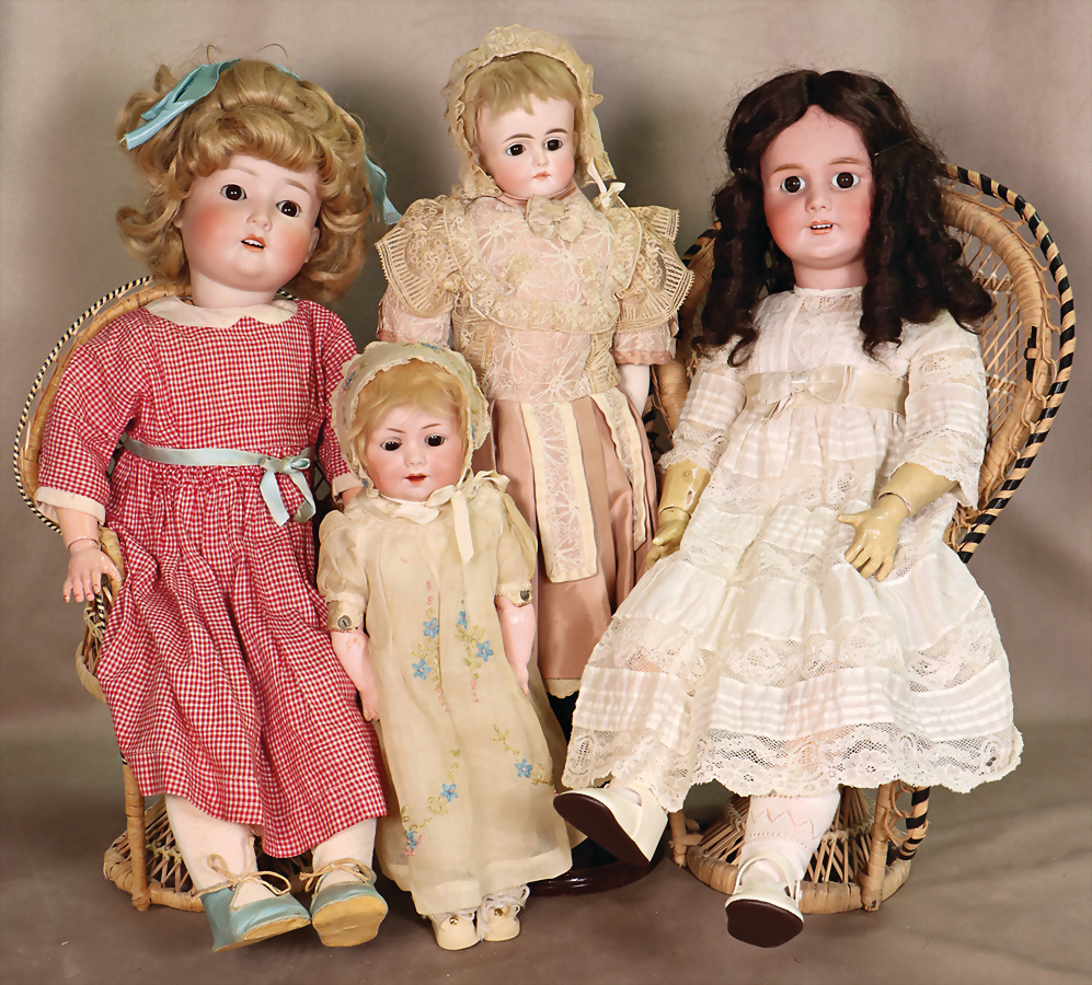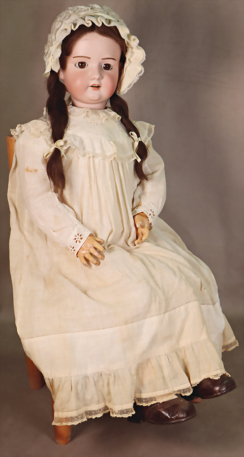 Konv. Puppen, Porzellan-Brustblattkopf-Puppe, Vollkopf, 53 cm, Brustblattkopf, braune fest einges. Glasaugen, geschl. Mund, Brustblatt restauriert, Hände restauriert, SCHÖNAU & HOFFMEISTER, 1909, Porzellankopf-Puppe, 60 cm, braune Schlafaugen, off. Mund, oben Zähne, Gliederkörper, Echthaar-Perücke, neuer, SIMON & HALBGI / EMILE JUMEAU, gem. DEP, Porzellankopf-Puppe, 60 cm, Kurbelkopf, zerbrochen u. geklebt, stark bespielter Gliederkörper, Perücke neuer, ARMAND MARSEILLE, 760, Brustblattkopf-Puppe, 37 cm, für im Kopf einzubauende Stimme, Kopf geklebt