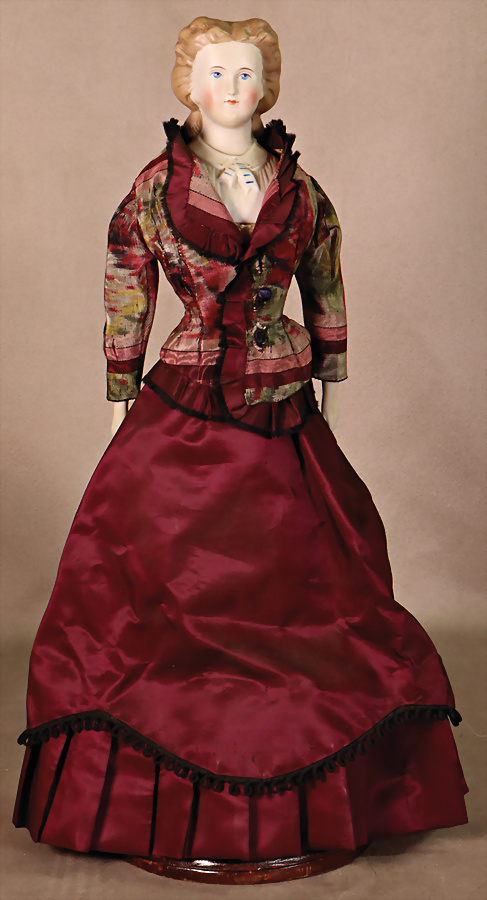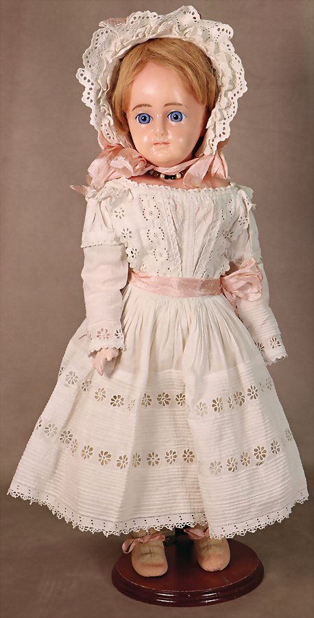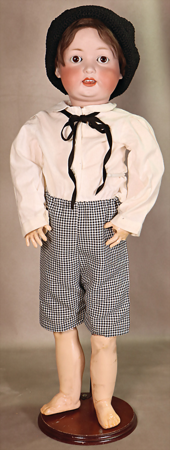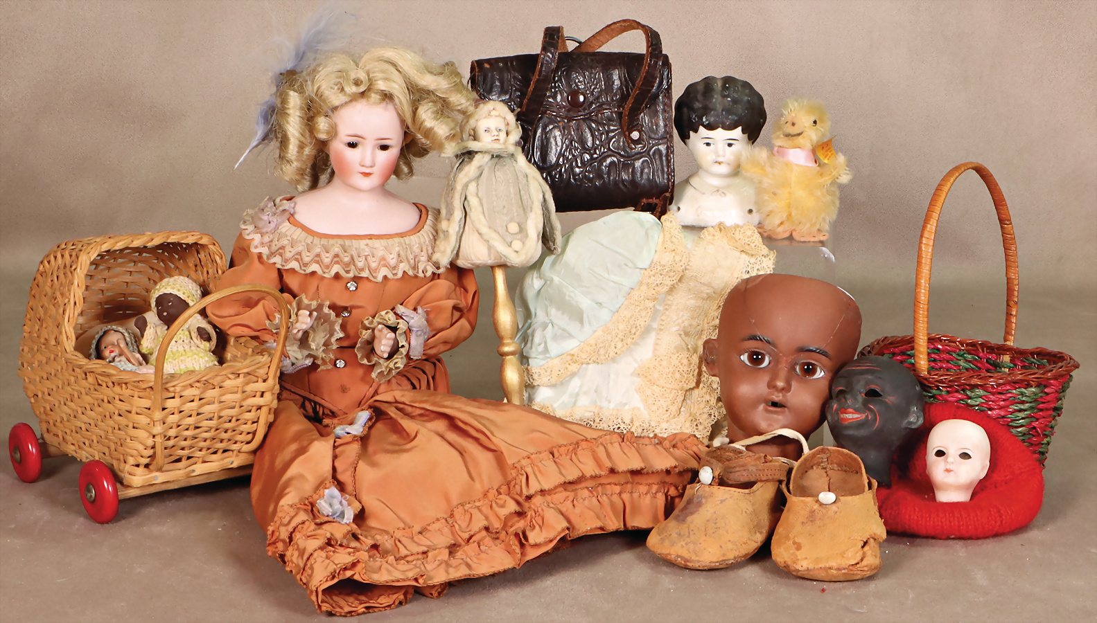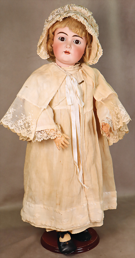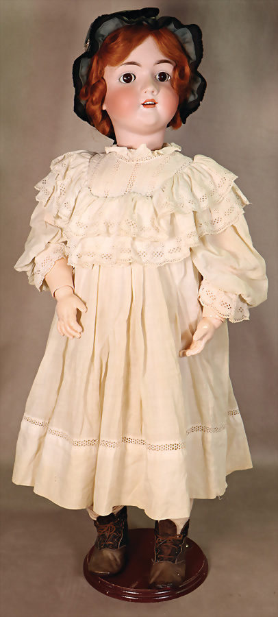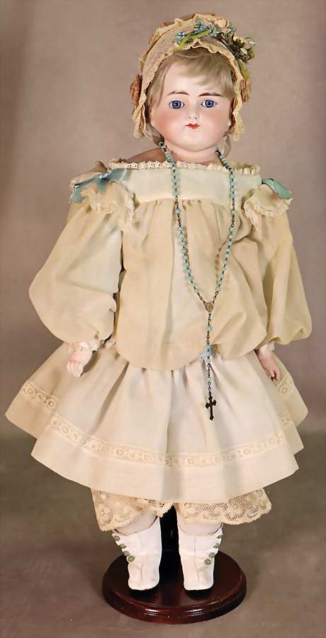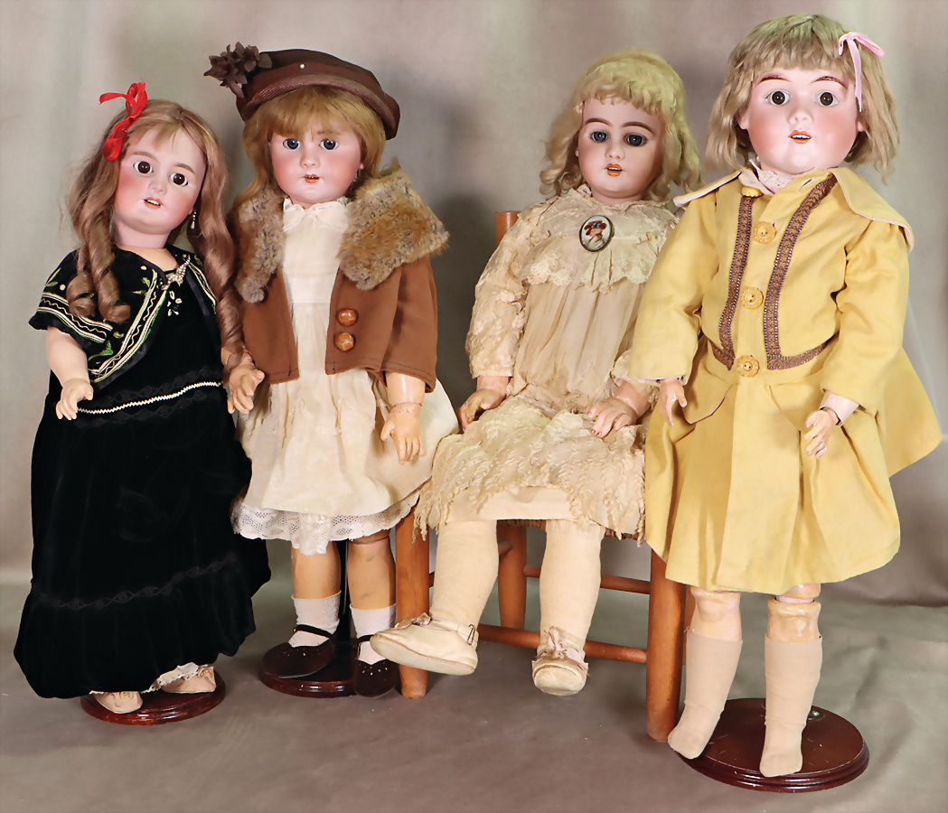 Konv. Puppen, Porzellan-Brustblattkopf-Puppe, Vollkopf, 53 cm, Brustblattkopf, braune fest einges. Glasaugen, geschl. Mund, Brustblatt restauriert, Hände restauriert, SCHÖNAU & HOFFMEISTER, 1909, Porzellankopf-Puppe, 60 cm, braune Schlafaugen, off. Mund, oben Zähne, Gliederkörper, Echthaar-Perücke, neuer, SIMON & HALBGI / EMILE JUMEAU, gem. DEP, Porzellankopf-Puppe, 60 cm, Kurbelkopf, zerbrochen u. geklebt, stark bespielter Gliederkörper, Perücke neuer, ARMAND MARSEILLE, 760, Brustblattkopf-Puppe, 37 cm, für im Kopf einzubauende Stimme, Kopf geklebt