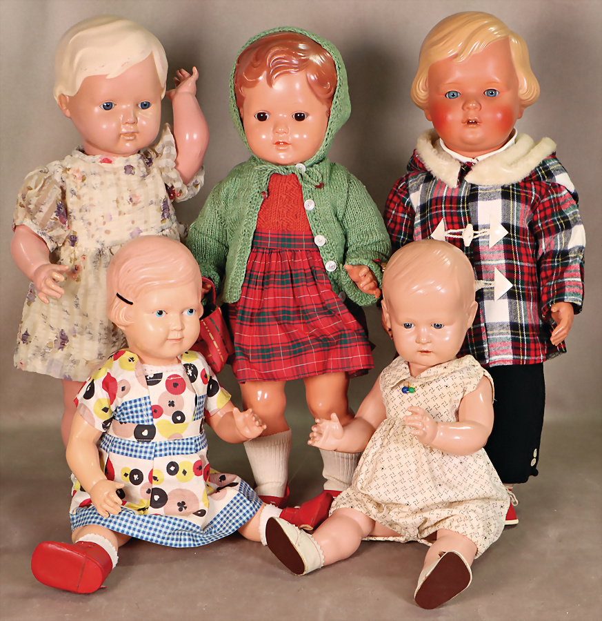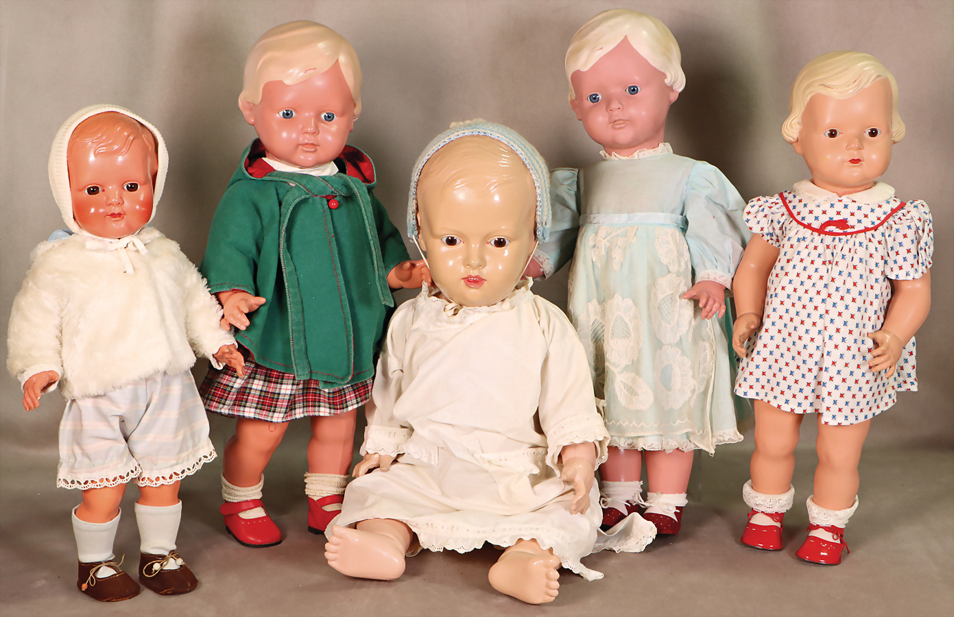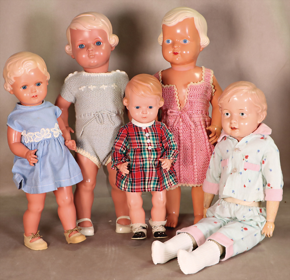 Konv. Puppen, Celluloid, CELLBA, Mädchen, PAUL HUNEUS, Junge, mit Igodi-Kopf, STORCH, Mädchen, mit Haarspange, SCHILDKRÖT, Christel, 49 cm, Erika, meist guter Zust., bitte Transportrisiko für Celluloid beachten
