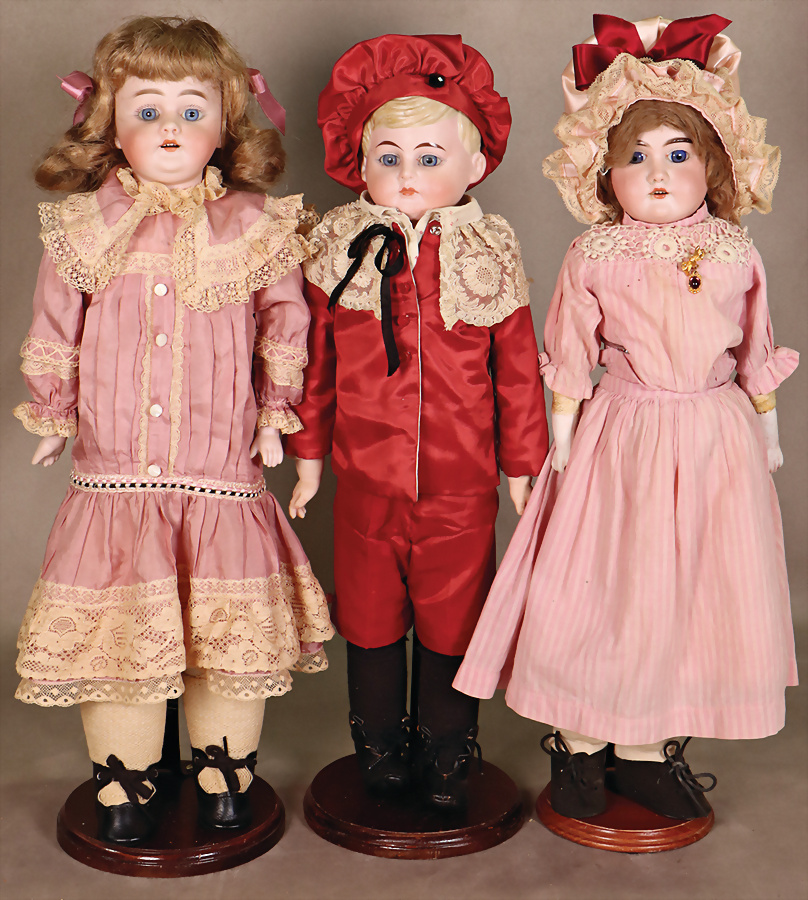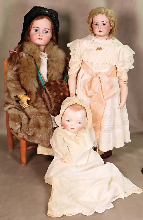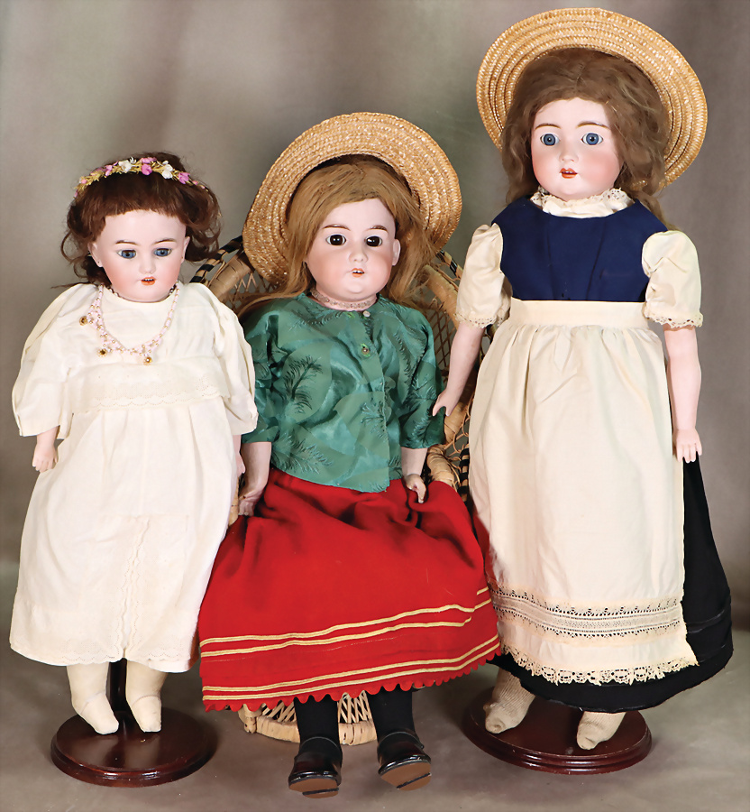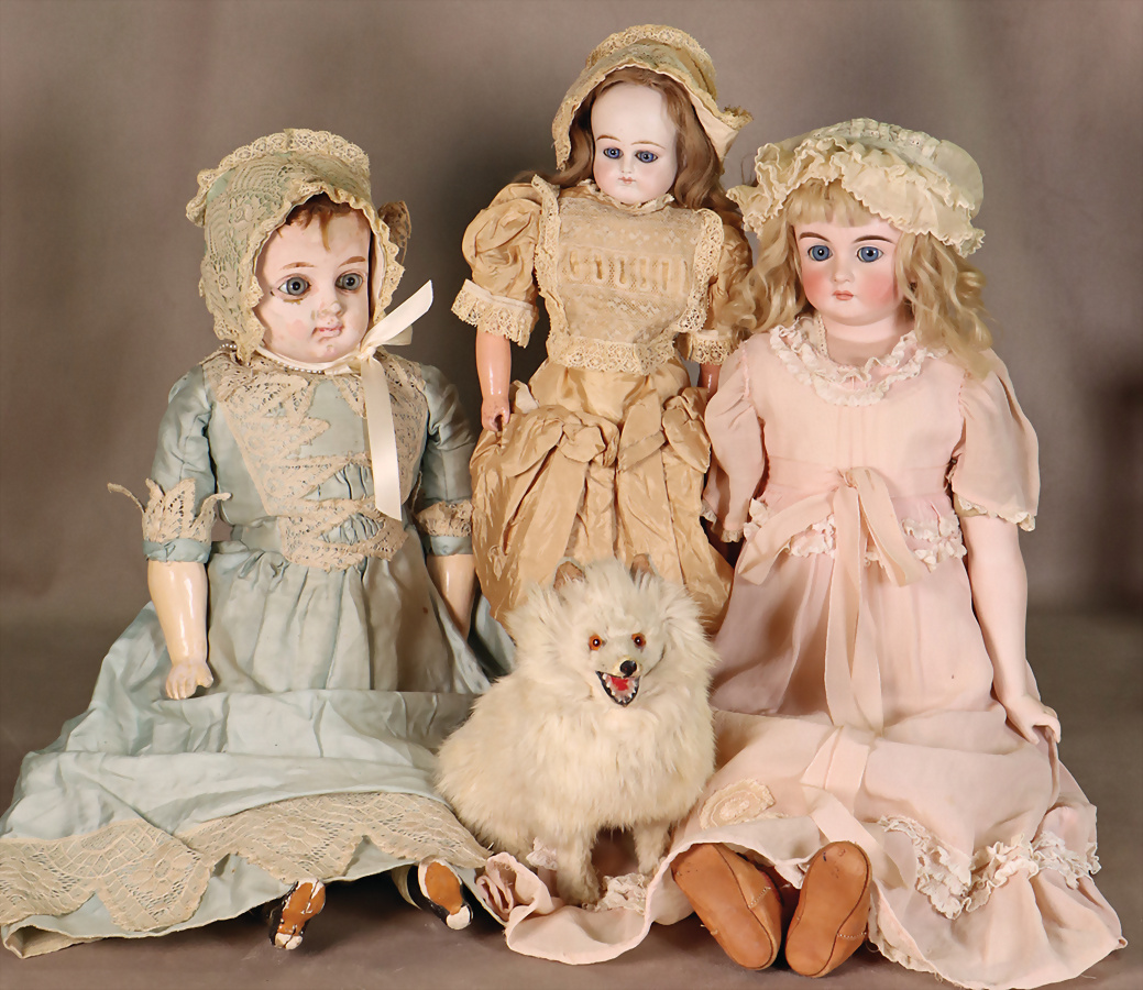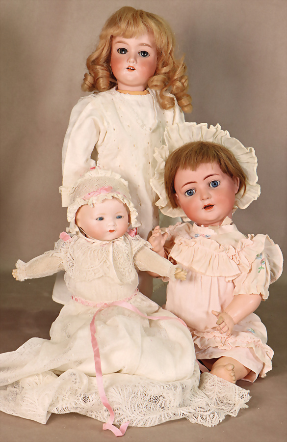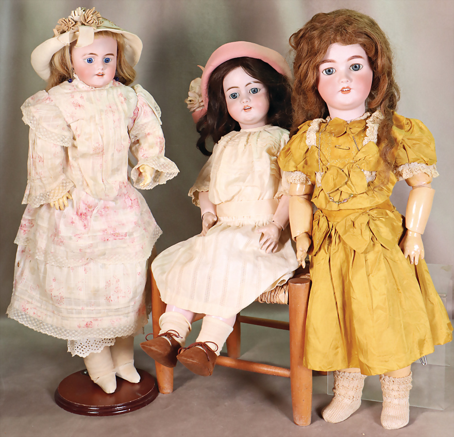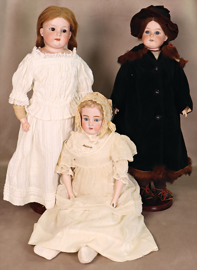 Konv. Puppen, SIMON & HALBIG, 1039 DEP, 70 cm, Kurbelkopf, blaue Schlafaugen, off. Mund, oben Zähne, Kinngrübchen, Perücke fest aufgeklebt, Puppe konnte nicht ausgeleuchtet werden, stark bespielter Gliederkörper, mit Fehlstellen, HEINRICH HANDWERCK, Biskuit-Porzellankopf-Puppe, 65 cm, Kurbelkopf, nachträglich fest eingesetzte Glasaugen, Kopf restauriert, Gliederkörper, Farbabweichung an den Händen, alte Mohair-Perücke, SIMON & HALBIG / EMILE JUMEAU, gem. DEP, roter Stempel Têtê JUMEAU, 61 cm, Porzellan-Kurbelkopf, restauriert, bespielter, franz. Gliederkörper, Laufkörper, Lauffunktion defekt, Arme falsch, Kopf restauriert
