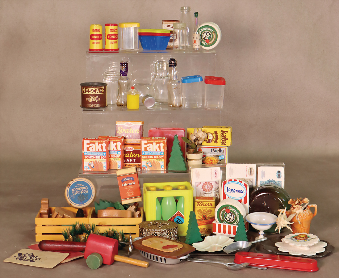 Konv. Puppenküchen-, Kaufladen- u. Stubenteile, Blech, Glas, Porzellan, Pappe